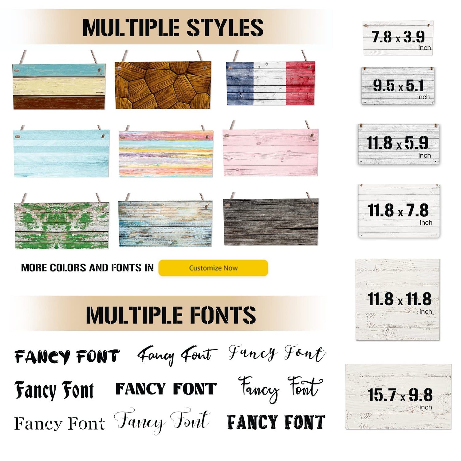 - 🟢Multiple Sizes and Backgrounds - We provide up to 100 different wood plank background colors, 20 different fonts and 50 font colors (in "Customize Now"), you can choose the one you like to design