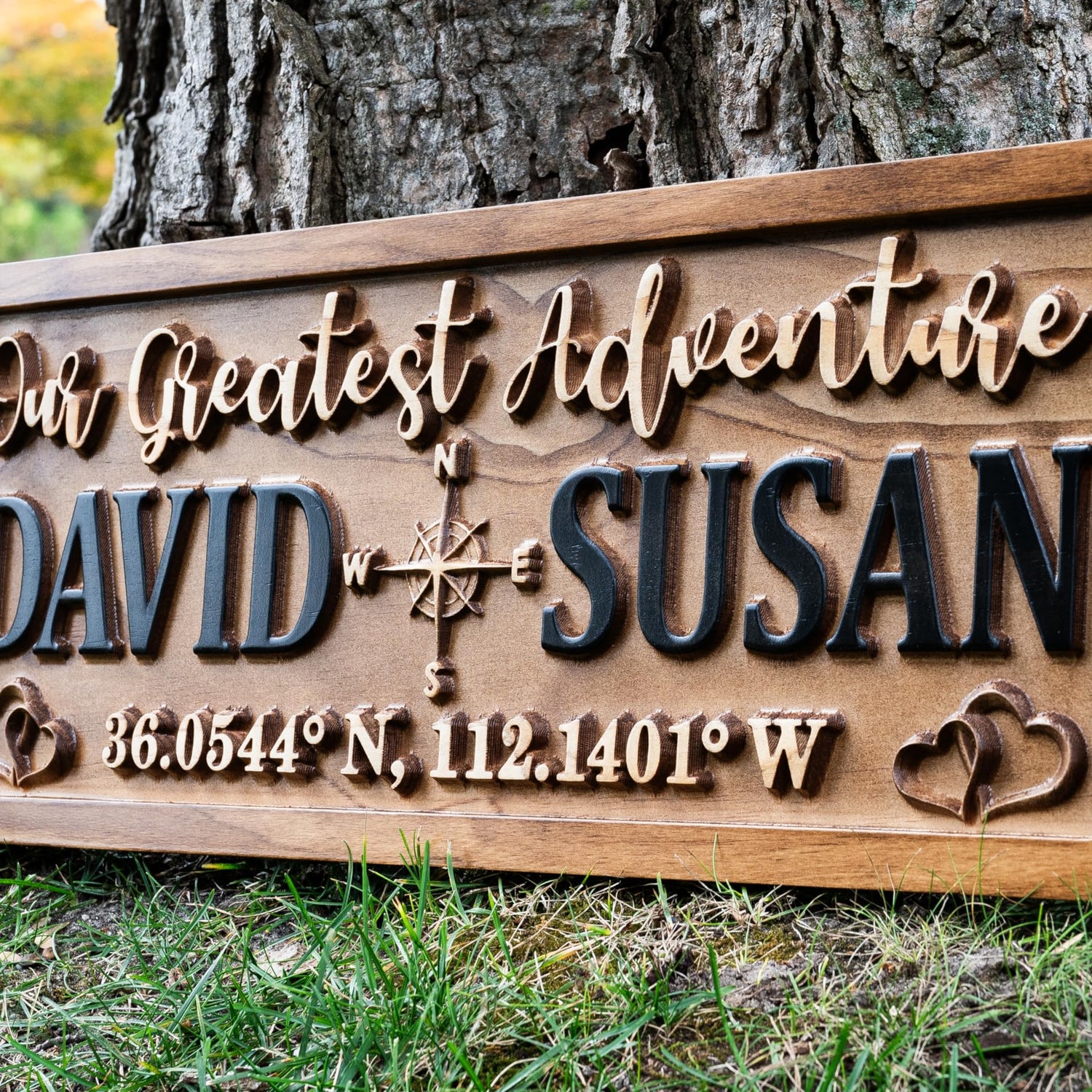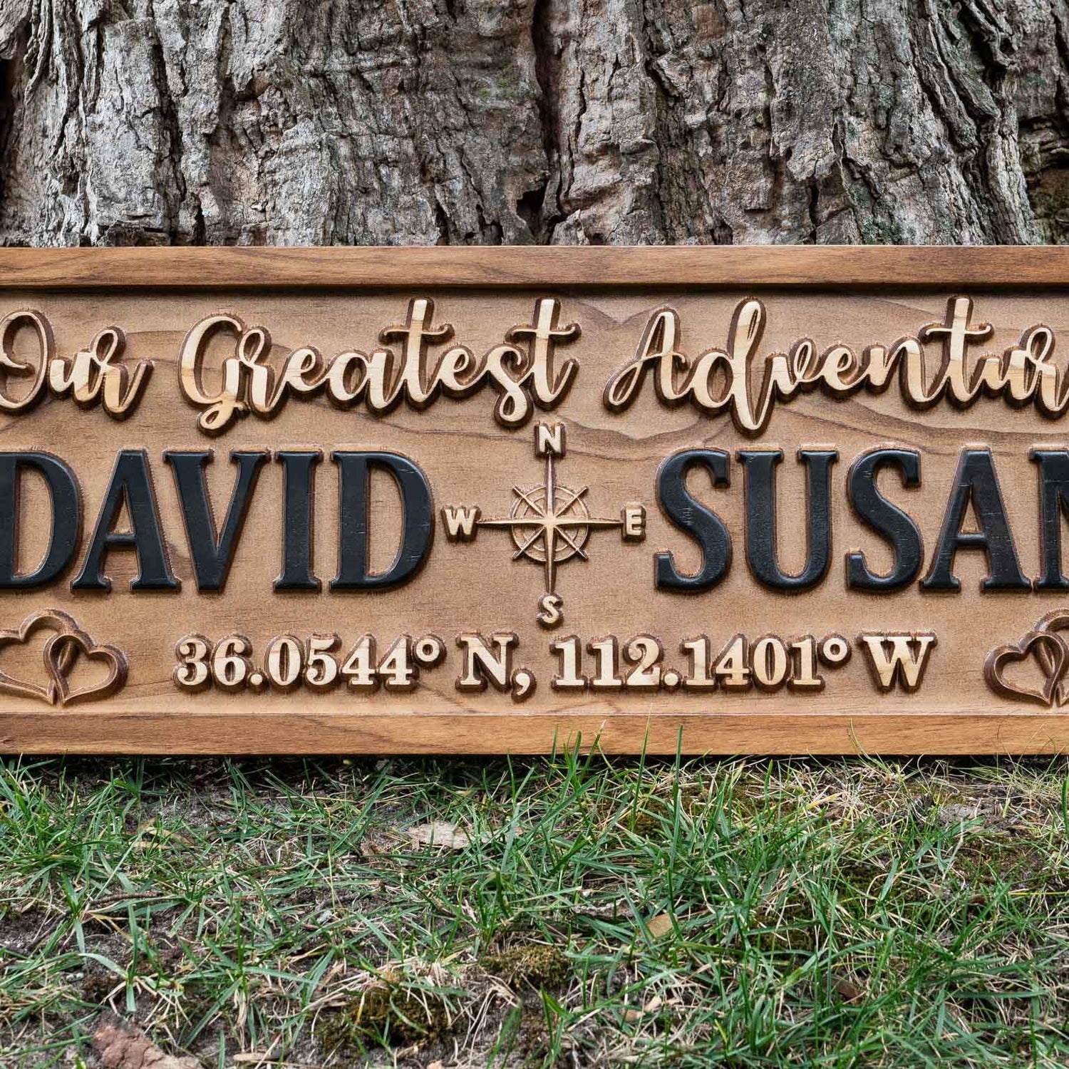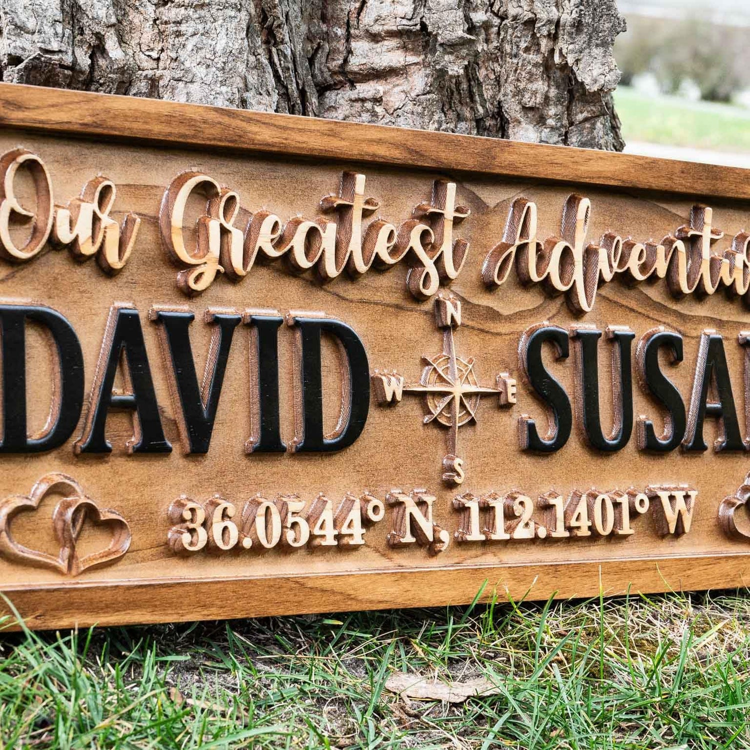 Details: You're looking at a personalized couples wood sign with a compass and hearts! The sign carved from 3/4" Solid Pine and is made using a two tone stain finish that's finished with a sealer. Each sign includes a sawtooth hanger on the back for quick and easy hanging. Notice the 3D lettering and images that pop right out of the sign. This unique and beautifully crafted sign is truly one of a kind. Every sign is handmade out of premium quality pine. We finish our signs with an indoor/outdoor sealer but do not recommend placing outdoors in the direct elements. The harsh wind, snow, rain, and sun can take its toll on the sign over time. Provide partial protection from these elements if placed outside. Please message us if you have any questions. Thank you!
