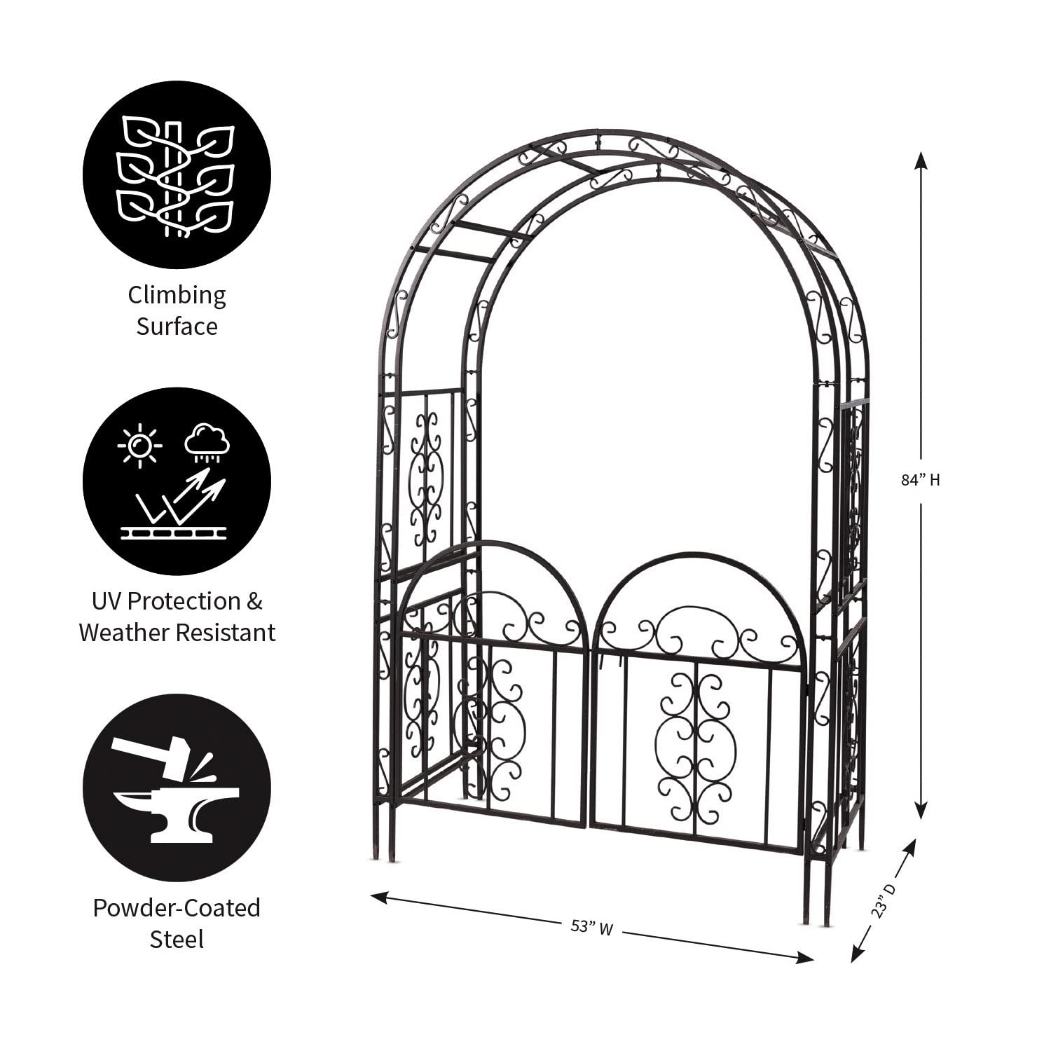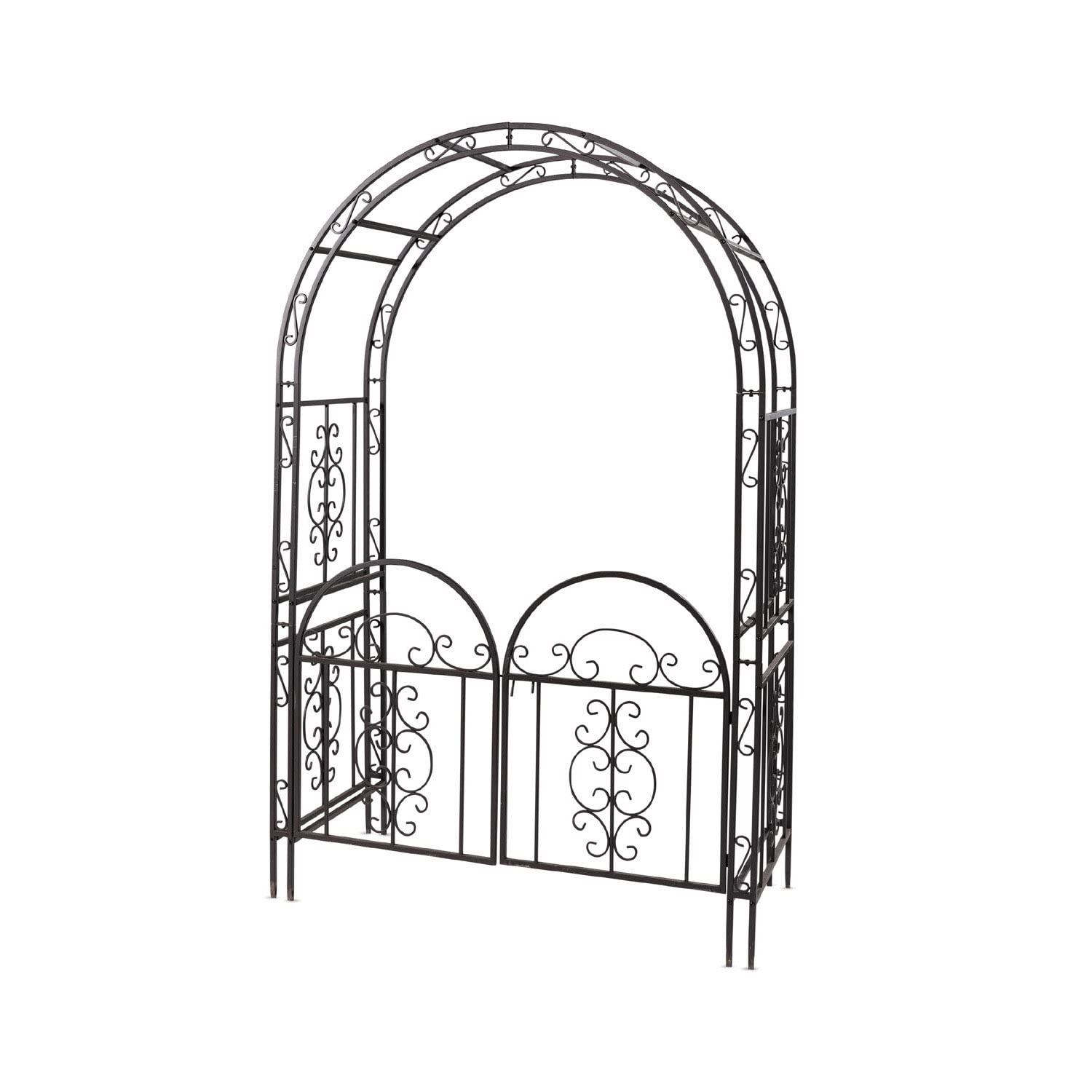Plow & Hearth Arch Metal Outdoor Garden Arbor Double Gate | Montebello | 84" H x 53" W x 23" D | Gunmetal Black | Trellis Lattice Climbing Plants