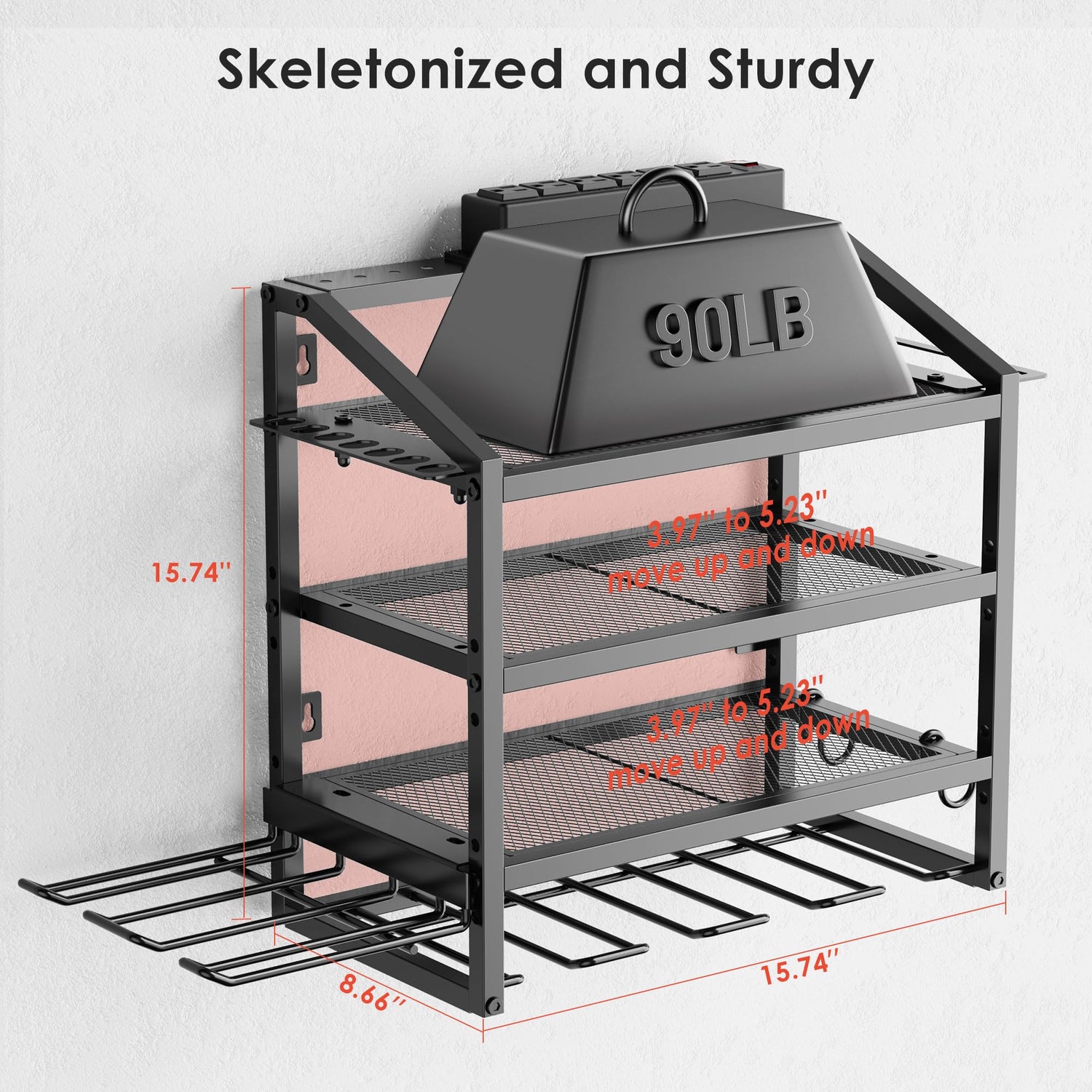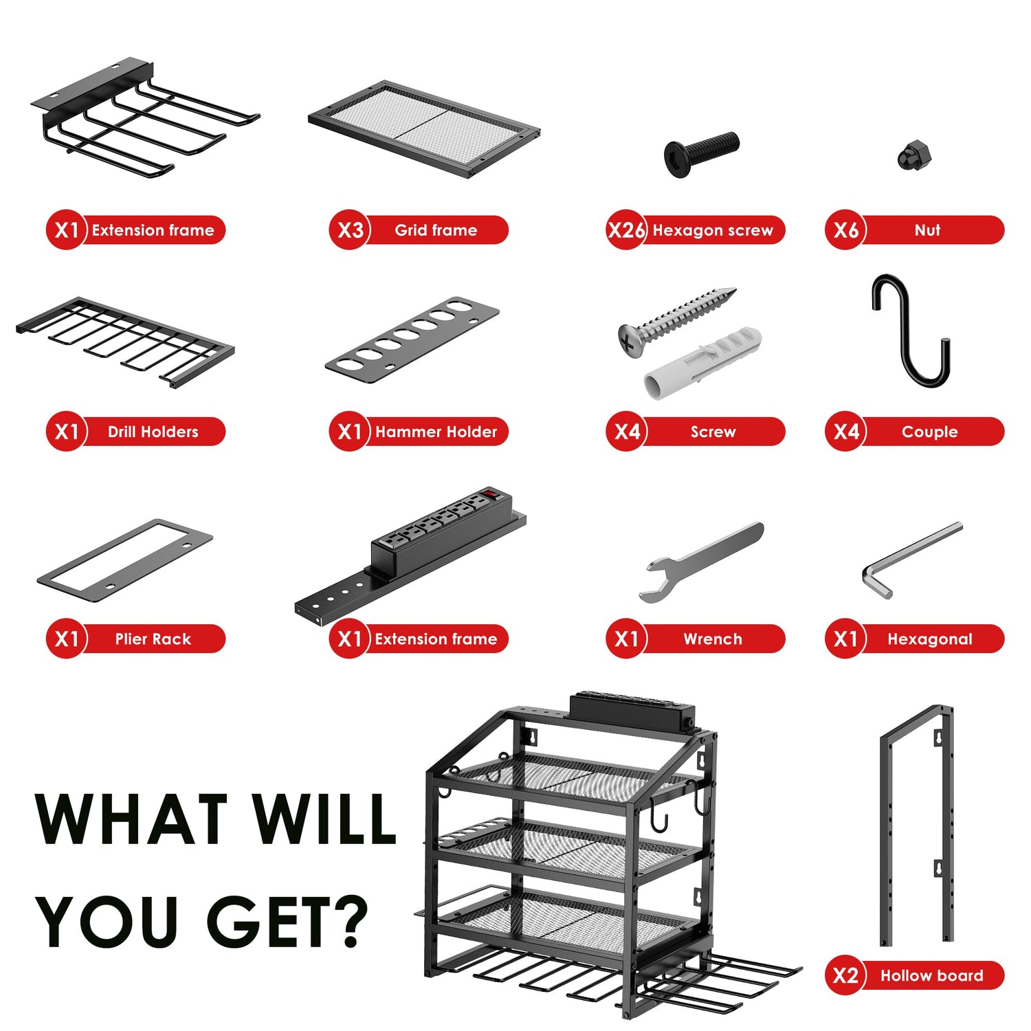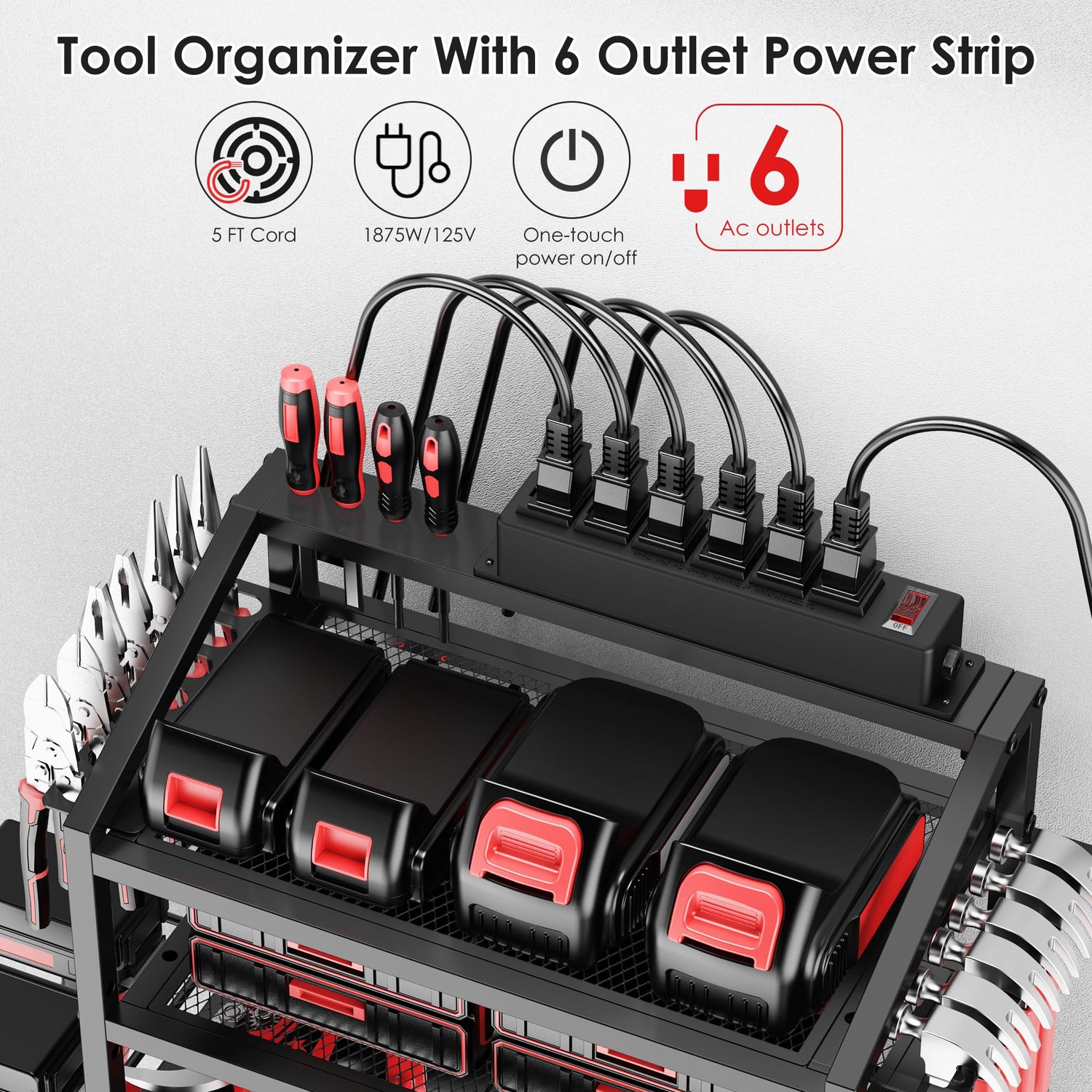 - Upgraded Tool Organizer with Charging Station: The power tool organizer with power strip is equipped with 6 outlets and is very convenient for charging tool batteries. This power tool organizeris suitable for a variety of places such as garages, tool rooms, yards and more.