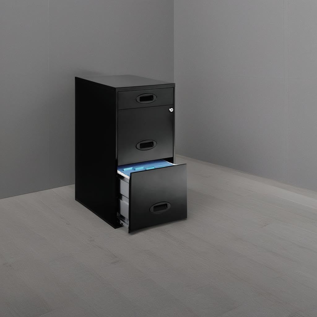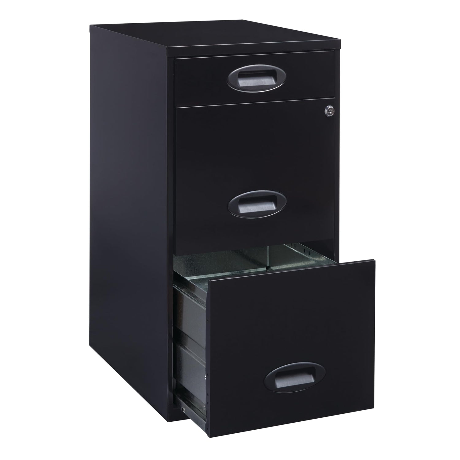 Details: Secure important documents with this Realspace SOHO cabinet. The 3 drawers accommodate files and small office supplies, while the vertical design saves floor space. A patented glide suspension system enables smooth opening and closing. Featuring a black finish, this storage cabinet works well with a variety of design schemes. This Realspace SOHO cabinet comes with a key for locking the two top drawers, and the metal construction provides durability. Features metal construction with a black finish. 3 drawers store loose sheets and small accessories. Patented glide suspension system supports smooth operation. Cabinet measures 27"H x 14-1/4"W x 18"D. Save time - no assembly required. Realspace 18"D 3-drawer file cabinet in black matches a variety of décor. GREENGUARD Gold certified - certified for low chemical emissions: UL.COM/GG - UL 2818. Ranked in two tiers: Certified and Gold. Tested to meet ANSI/BIFMA Performance Standards - Manufacturer testing has been conducted on this product to meet specific performance requirements and safety standards set forth by the American National Standards Institute (ANSI) and the Business and Institutional Furniture Manufacturers. Less harsh chemicals - made with fewer harsh chemicals, or safer chemicals than typical alternatives, helping reduce your use of and exposure to substances that may be more harmful to your health and the environment. Contains Recycled Content - See Specs for Details.