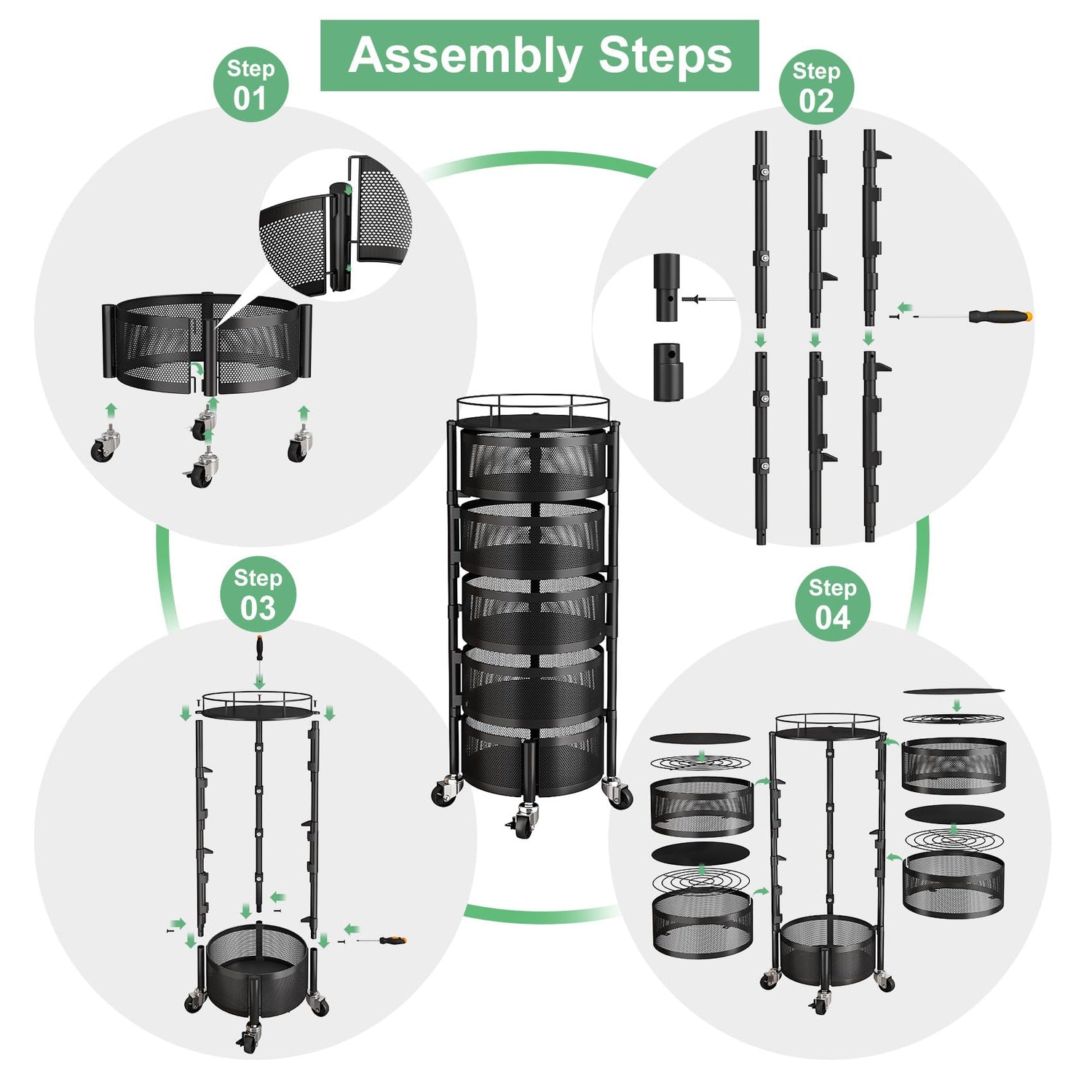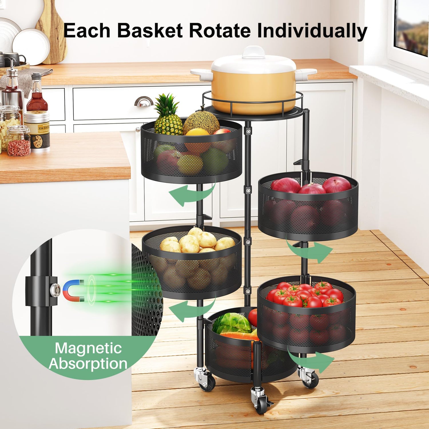 - 【Rotation Storage Rack】5 Tier rotating fruit basket design with 360° swivel wheels and 270° rotating basket allow you to take vegetable or fruits out easily. The high fence of 5.1" protects the goods well while not falling down. Additionally, the hollow design of the wire basket raise the air circulation to keeps your fruit vegetable fresh