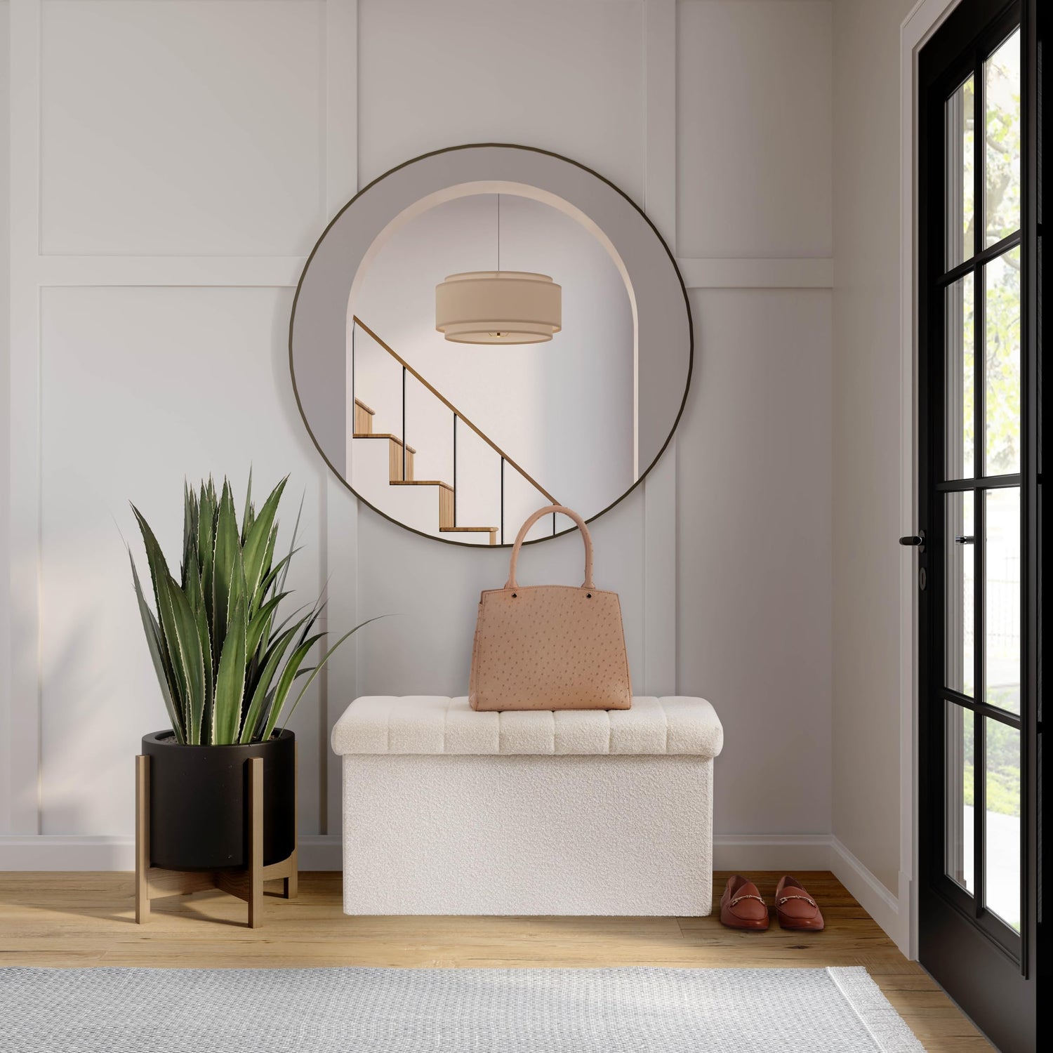 Details: Seville Classics 30” wide upholstered tufted storage bench/ottoman in white boucle is an upscale functional furniture with storage under the cushioned lid for organizing blankets, clothing, and shoes. The ottoman design folds away in closets and under beds when not in use. Made of soft boucle fabric with cushioned foam in lid supported by a solid MDF frame. Overall dimensions are 30” W x 15.7" D x 15.7" H with sitting up to 500 lbs. on the lid and up to 50 lbs. for the interior base.