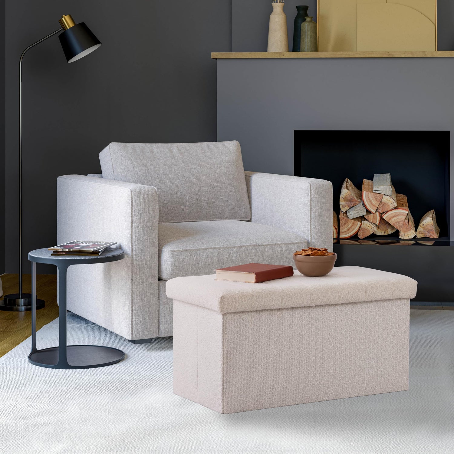 - STURDY BUILD – Featuring a soft boucle fabric with premium cushioned foam in the lid supported by a solid MDF frame.