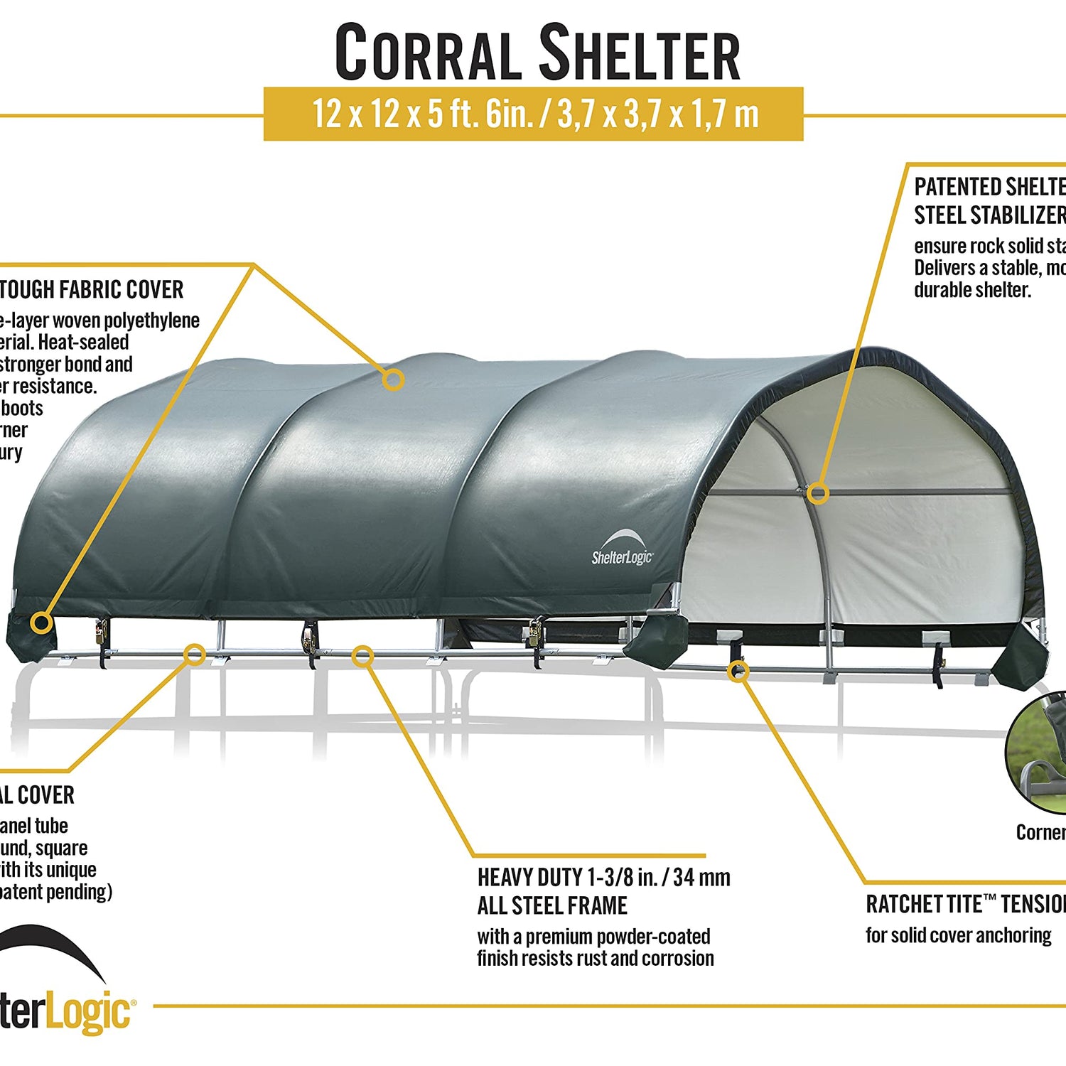 Details: The ShelterLogic Corral Shelter and Livestock Shade Universal Cover is a multi-purpose, portable shade and shelter structure and one of our most convenient equine innovations yet. Made from an all-steel metal frame that is 1-3/8 inches, the portable animal shelter is tough and durable. The metal frame is bonded with a premium powder-coated finish that prevents chipping, peeling, rust, and corrosion. The patented ShelterLock stabilizers ensure rock solid stability that delivers a secure, more durable shelter. The ShelterLogic Corral Shelter is designed for use in every season and can protect your items from sunlight, rain, tree sap, and more. Features the Ratchet-Tite tensioning system that ensures the cover is tight and neat looking. The frame cover is UV-treated inside and out with added faded blockers that results in a fabric cover that withstands the elements. With a 7.5-ounce Ripstop fabric and waterproof cover , the Corral Shelter is sure to provide protection for your animals, hay, and agricultural items. With 147 square feet of storage space, the ShelterLogic Corral Shelter is great for horses, goats, other livestock animals, and even agricultural storage. A good quality structure at an affordable price. With a 1-year limited warranty, you can be confident in the quality of your purchase. Assembled Exterior Dimensions: 12' x 12' x 5'6" Assembled Interior Dimensions: 12' x 12' x 5'1" Total Storage Area: 147 sq. feet Purchase Includes: (1) 12'x 12' x 5'6" Frame (1) One-piece Green Fitted Cover (4) Protective Corner Boots (4) 15-Inch Auger Anchors (1) Complete Hardware Kit Easy Step-by-Step Instructions