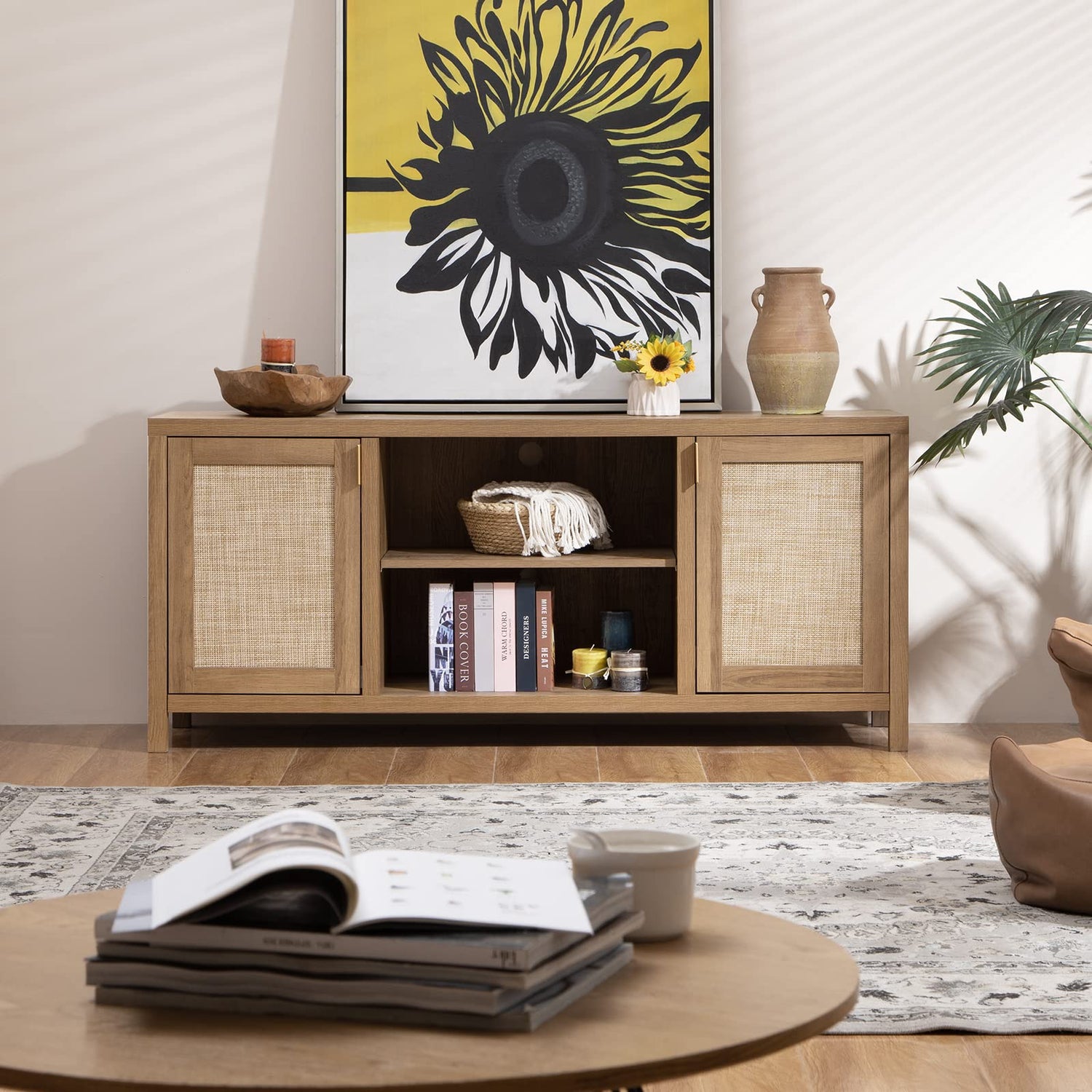 SICOTAS TV Stand for Living Room : Rattan TV Console Cabinet with Storage and Shelf, Boho Entertainment Center, 59" Media Console for 55, 65 Inch TV, 26" Tall Wood Television Stands, Oak