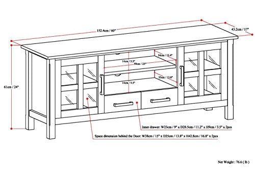 Details: The TVs just keep getting bigger and bigger. You really need to find that perfect TV Stand that will accommodate the size of your TV, while allowing you to have comfortable viewing. The Kitchener TV Stand is perfectly sized for TVs up to 65 inches. The Kitchener TV Stand has plenty of storage and space for all your media and gaming devices. It has a large centrally located open area with one adjustable shelf and two drawers. The two side storage cabinets open to one adjustable shelf. The unit features cord management cut-outs for easy installation of TV and media components. Easy installation of TV and media components. Style includes a square edged table, Brushed Nickel pulls and square legs. Efforts are made to reproduce accurate colors, variations in color may occur due to computer monitor and photography. At Simpli Home we believe in creating excellent, high quality products made from the finest materials at an affordable price. Every one of our products come with a 1-year warranty and easy returns if you are not satisfied.