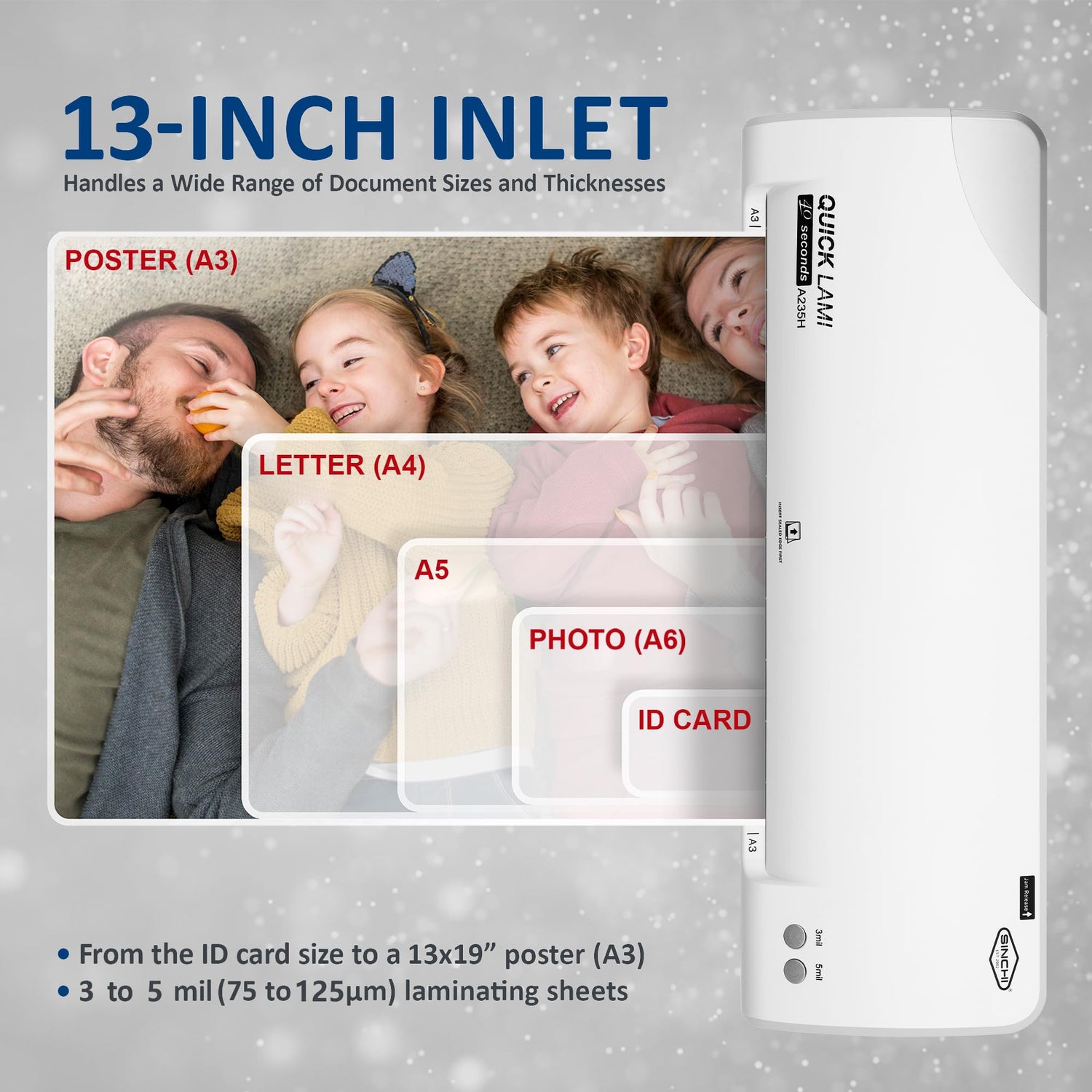 • 【Wide Compatibility】Unlike basic laminators, this lamination machine provides two individual temperature settings for 3 mil and 5 mil laminating pouches. The 13-inch inlet accepts all standard pouches up to 13” wide, from 13x19" posters to ID badge and business card size.