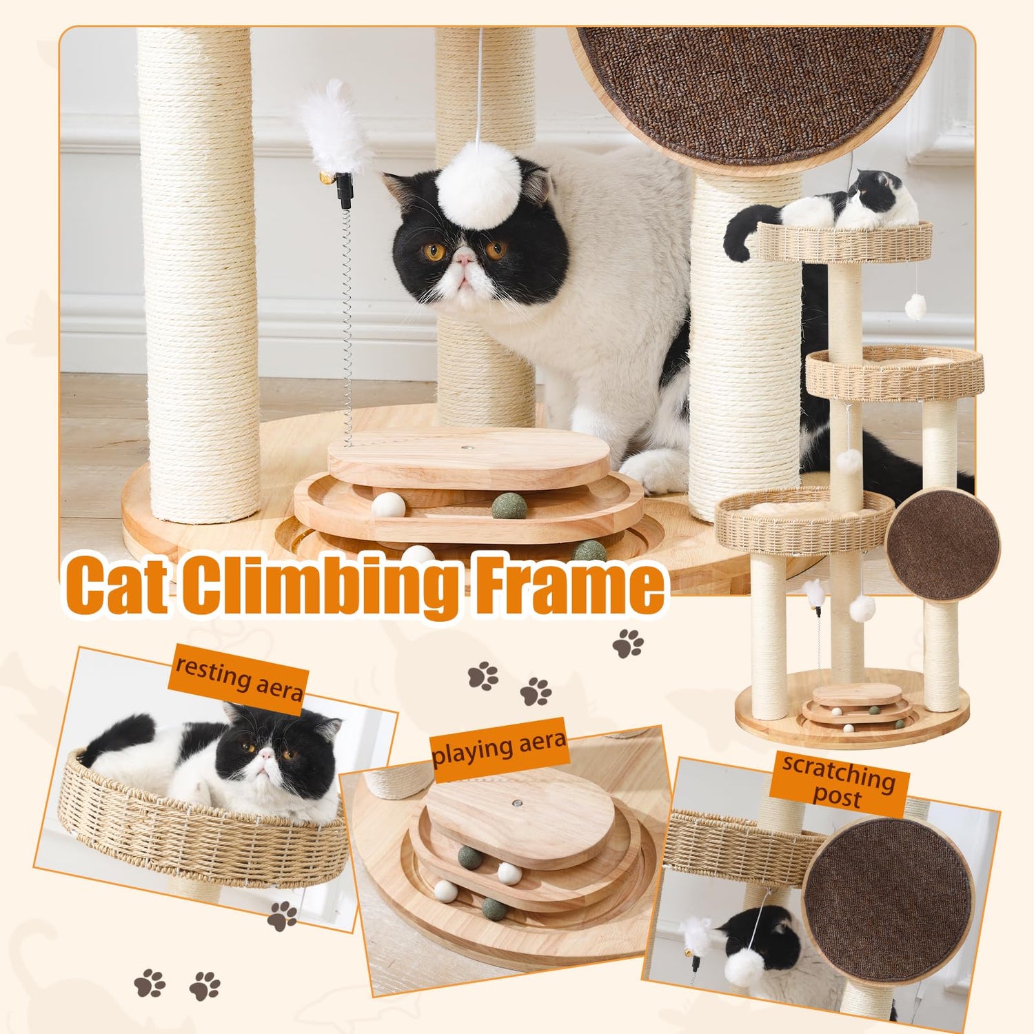 - 【Natural Materials】 This wooden cat tree tower is crafted from high-quality oak boards, oak cat beds, 8-cm kraft paper posts, and natural sisal ropes. These materials are eco-friendly, safe, and odor-free. Perfect as a cat tree for indoor cats large adult or a cat tree for large cat, it ensures durability and provides a natural cat scratching post with bed