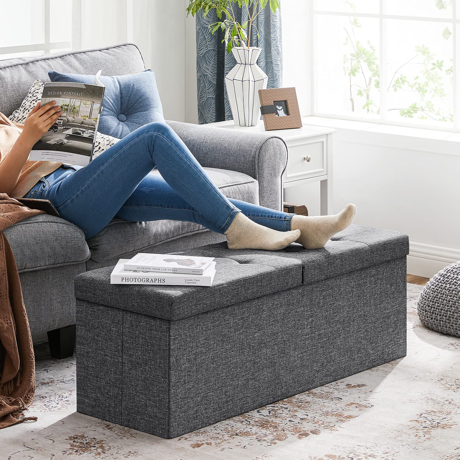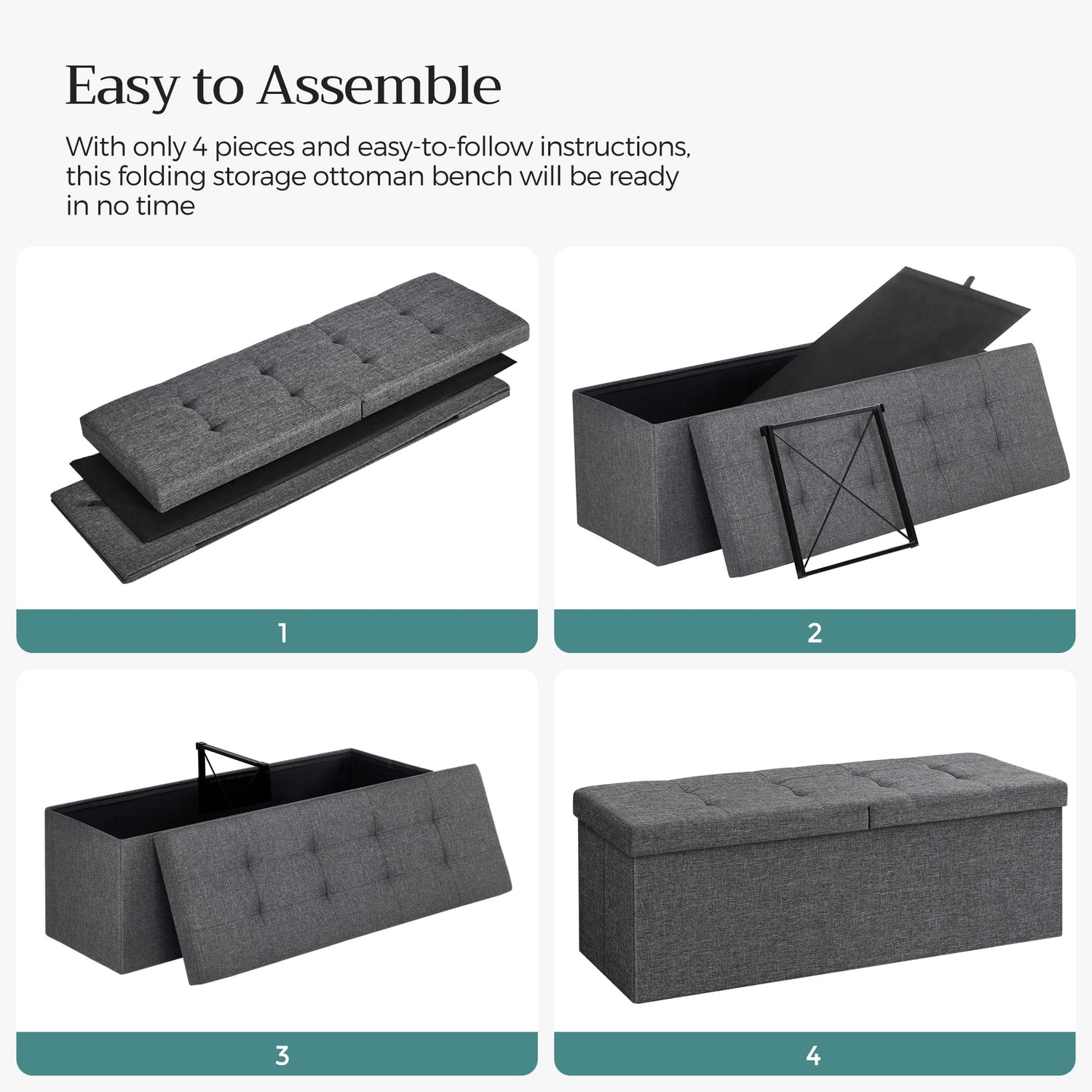 SONGMICS MAZIE Collection - 43 Inches Storage Ottoman, Foldable Storage Bench with Flipping Lid, 660 lb Load Capacity, for Entryway, Living Room, Bedroom, Dark Gray ULSF76GYZ