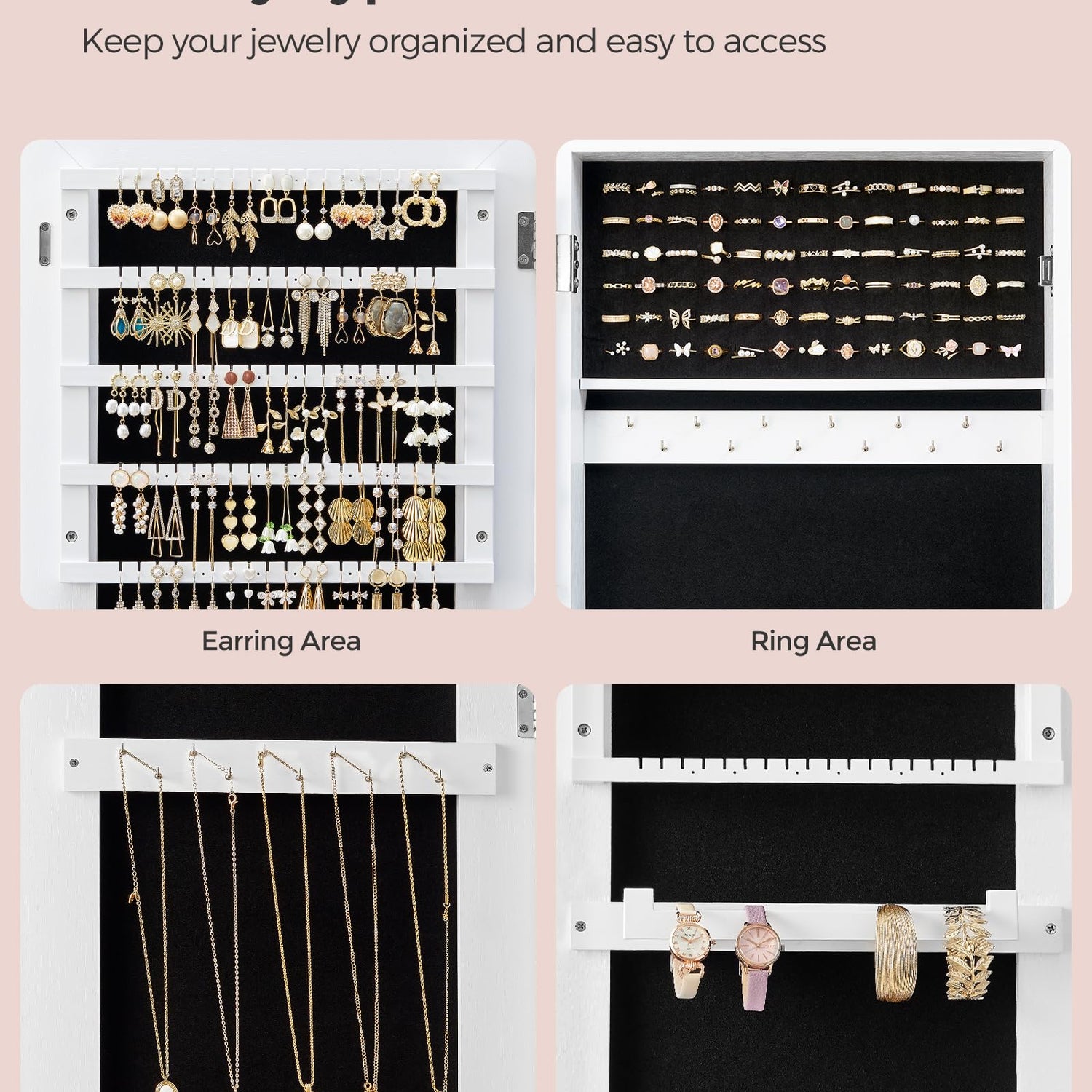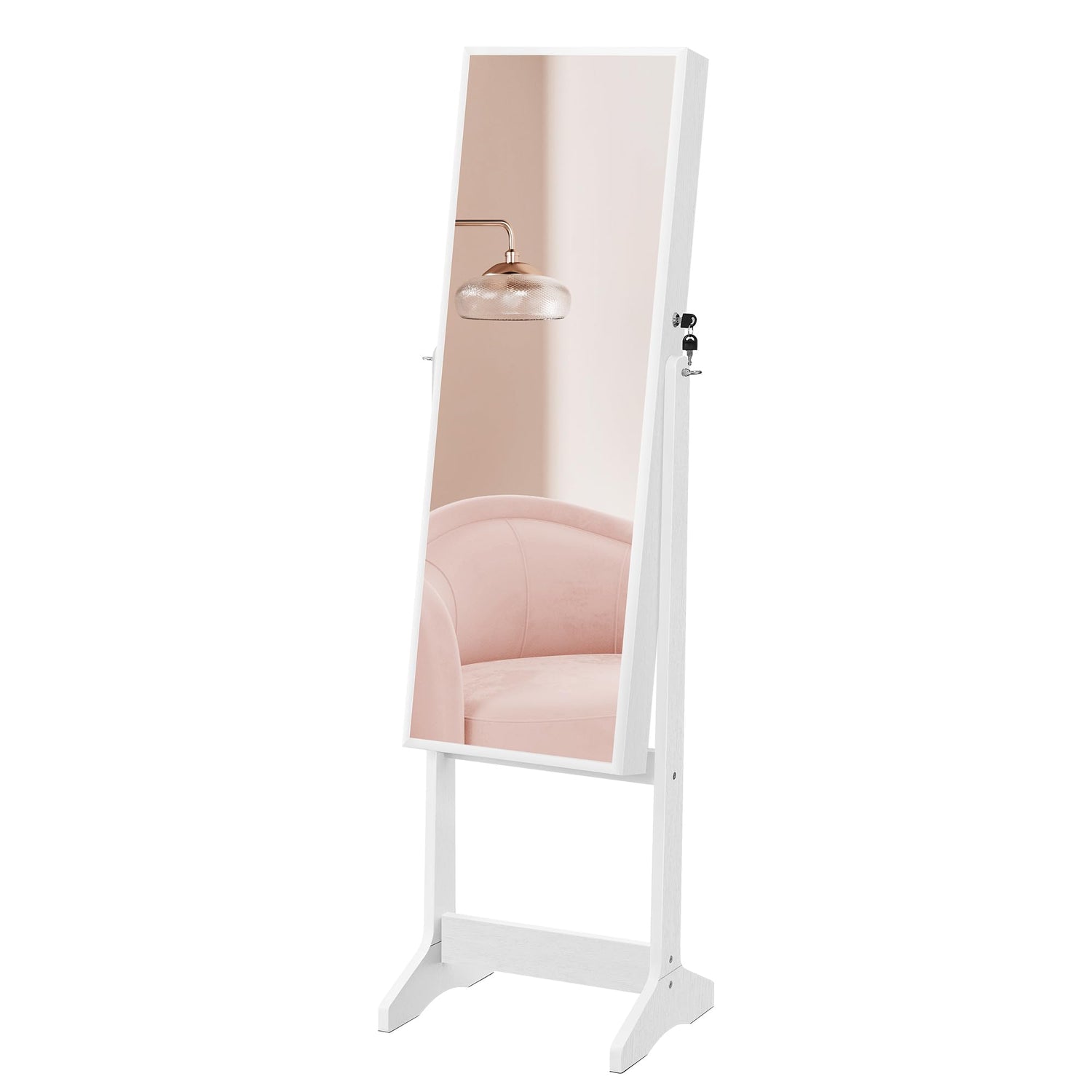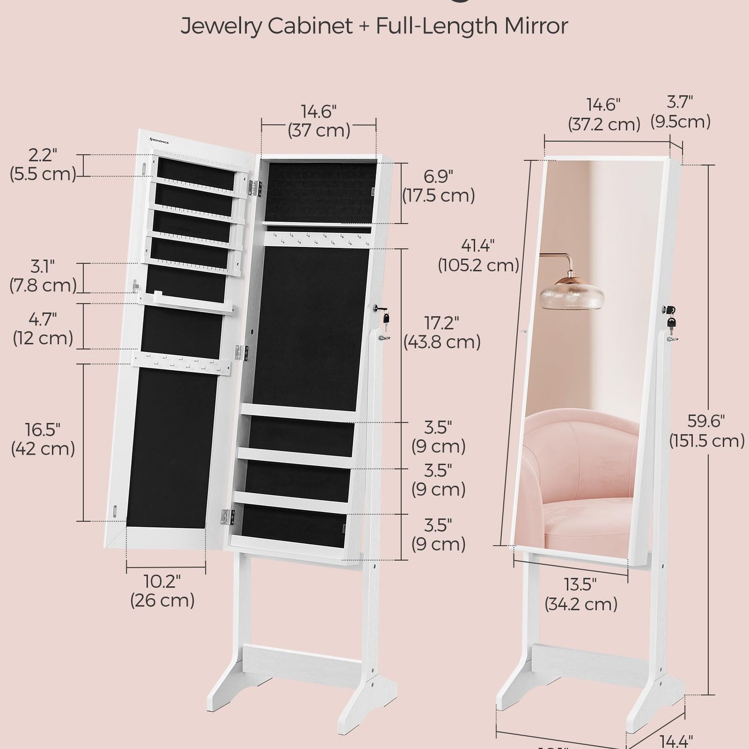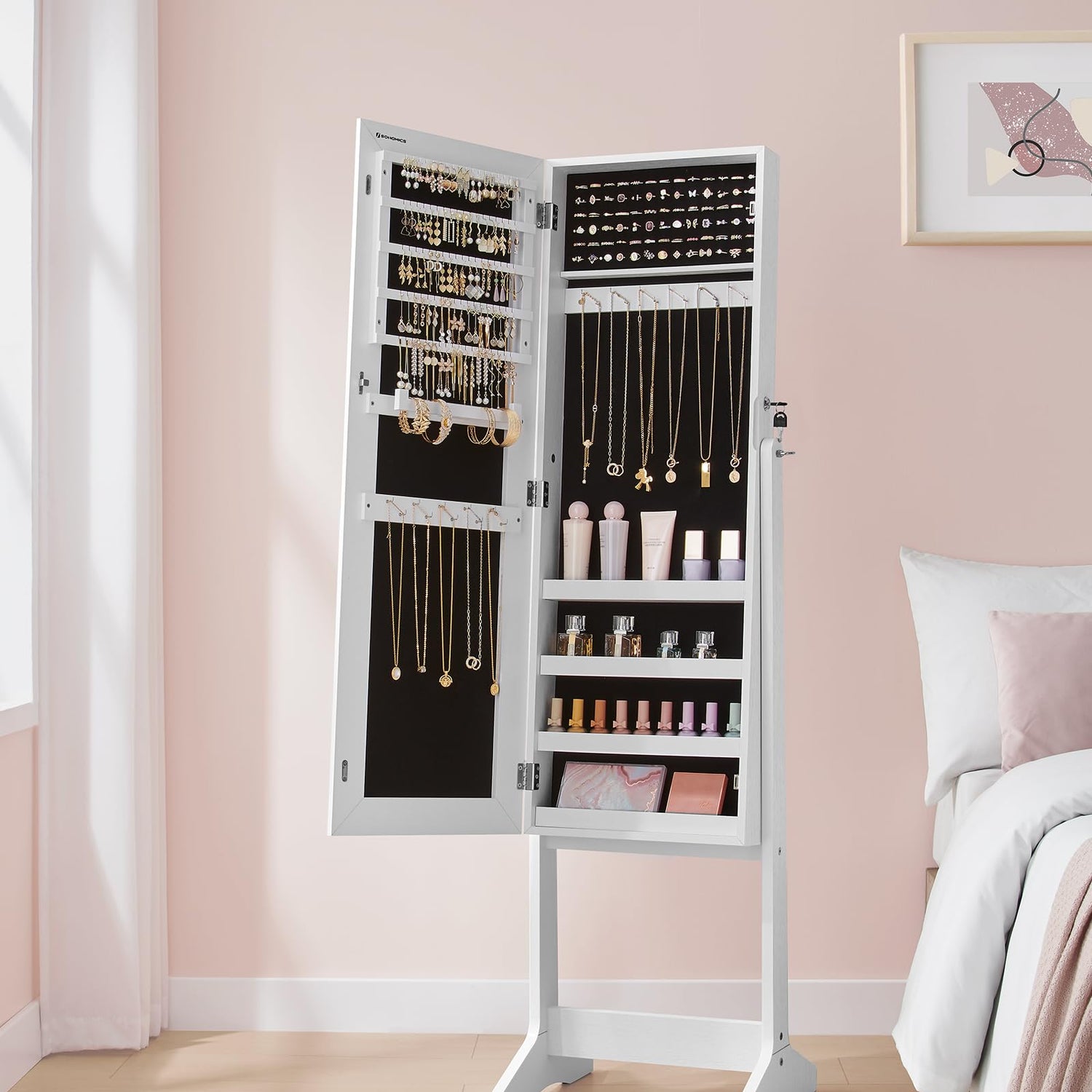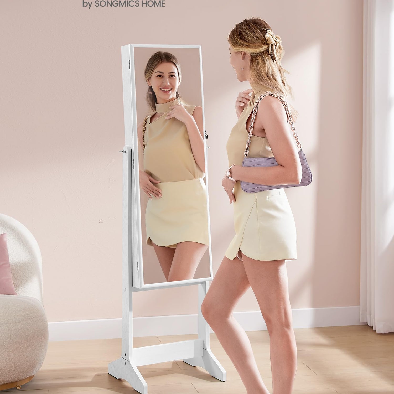 SONGMICS Mirror Jewelry Cabinet Armoire, Standing Full-Length Mirror, Lockable Jewelry Organizer, Gift Idea, White Surface and Black Lining UJJC69WT