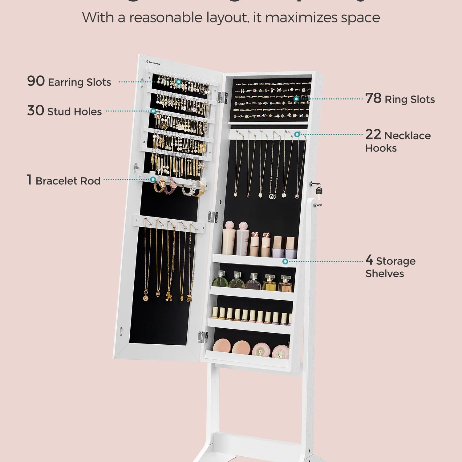 - [Storage Aplenty] There's plenty of room inside the standing mirror cabinet for your jewels—90 slots for earrings, 30 holes for studs, 78 slots for rings, 22 hooks for necklaces, and 4 shelves for your other beauty essentials