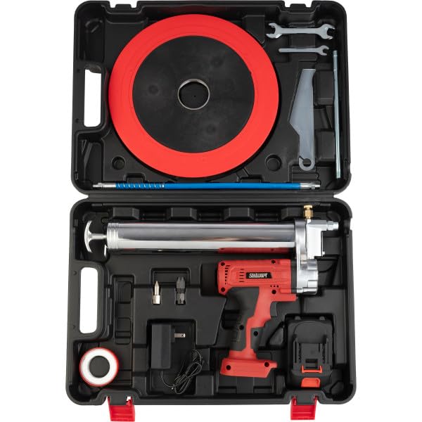 Stalwart Grease Gun - 20V 12000 PSI Cordless Grease Gun with 14-Inch Hose, Couplers, Lithium Ion Battery, Charger, and More - Tool Kit (Black/Red)