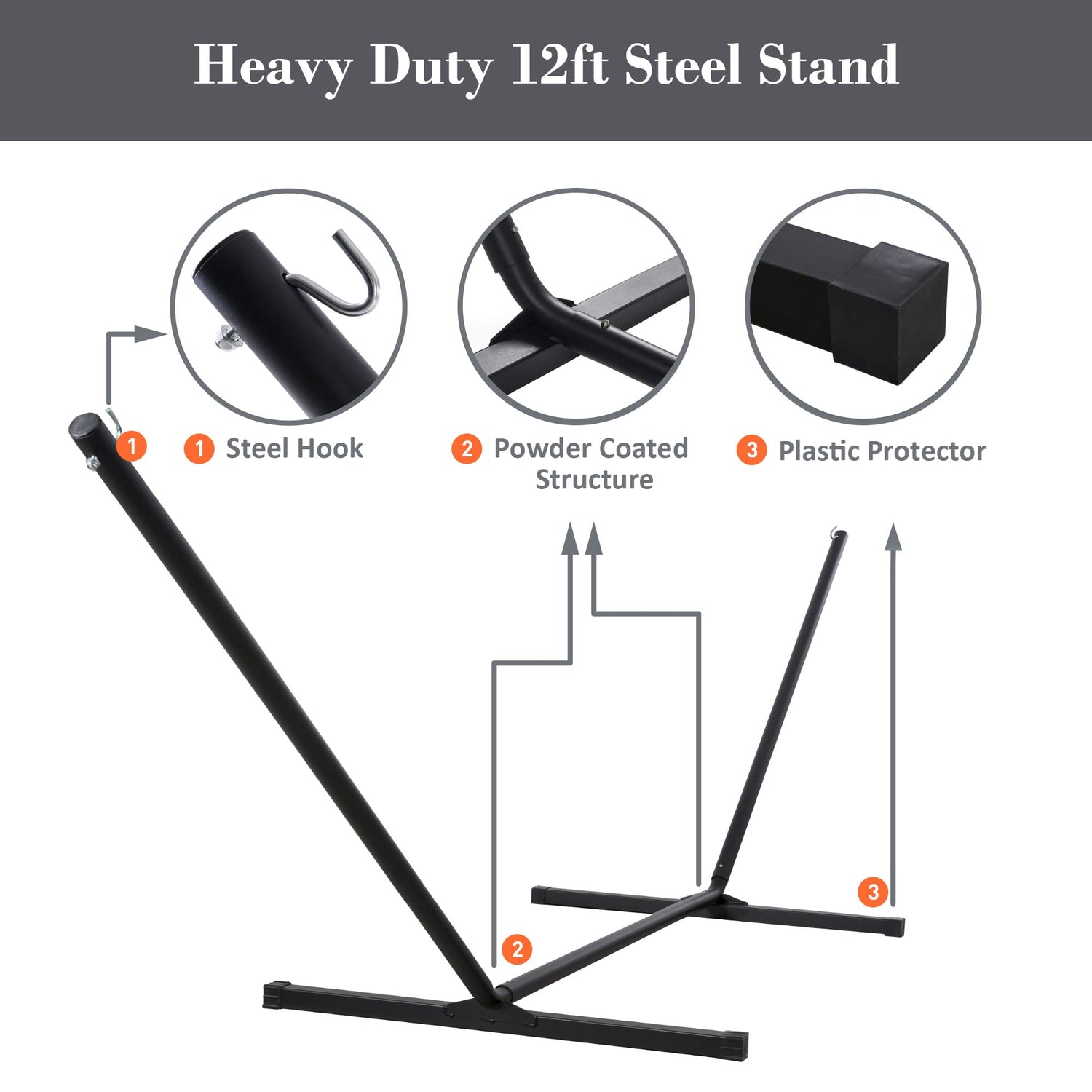 - Freestanding Hammock with Portable Stand: No damage to trees. Created to be stable and long-lasting, the 12 ft stand is made from powder-coated heavy gauge steel. It can be easily assembled in minutes without any tools, and it could be disassembled easily. Feel free to contact us if you have any questions during use within one year of purchase. We are always here to help