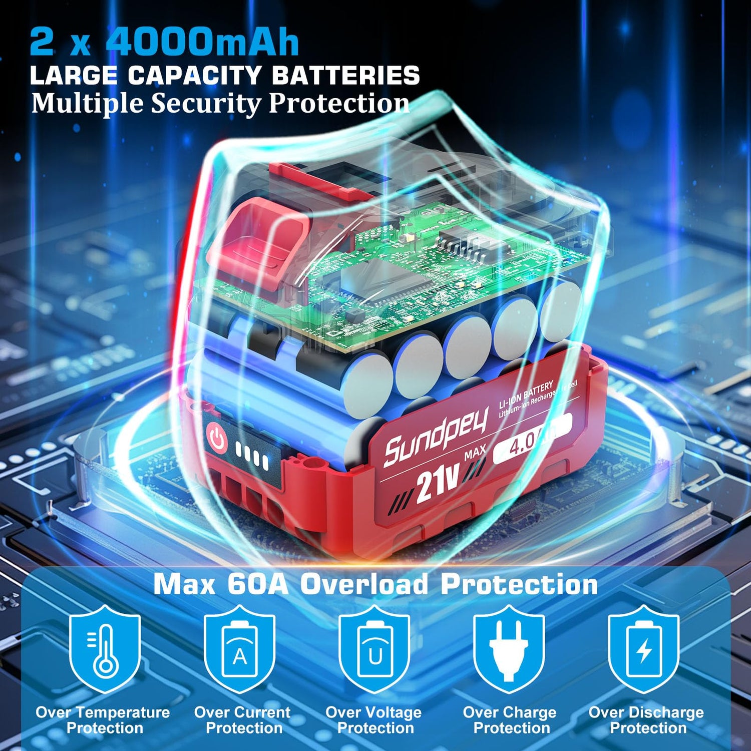 - Overload Protection: Our motor has 50A overload protection and battery has 60A overload protection, when the current exceeds this value, the protection device will cut off the power supply to prevent the motor and battery from being damaged due to overload. When the battery is working with continuous discharge, there is 40A overload protection (When the 1/2 inch impact driver is working under load for a long time, it may stop working, don't worry, this is the phenomenon of overload protection, you only need to dismantle the battery, let the battery and electric wrench rest for a while, and then re-installed to work)