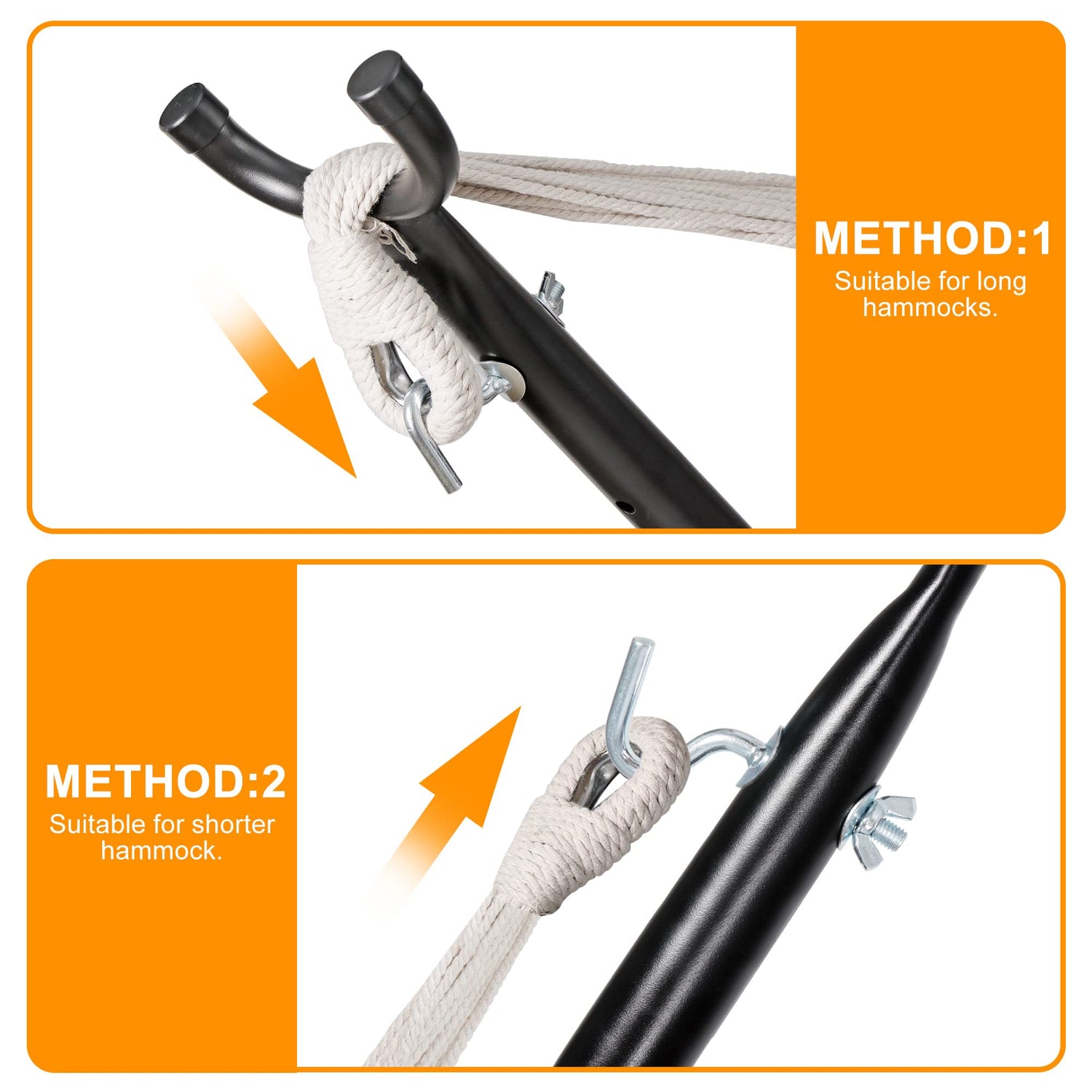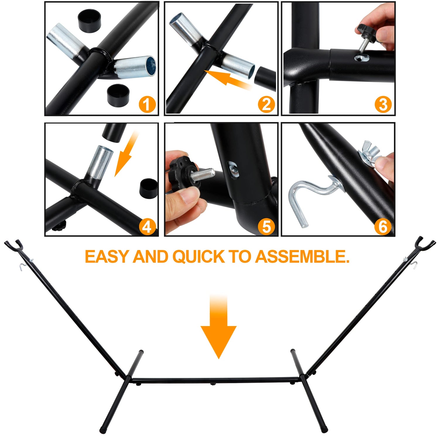 - 『Easy to Assemble』Super easy to assemble this hammock stand in minutes. Simply use the knob screws to connect the poles together then use the hooks to hang your hammock. No tools are required.
