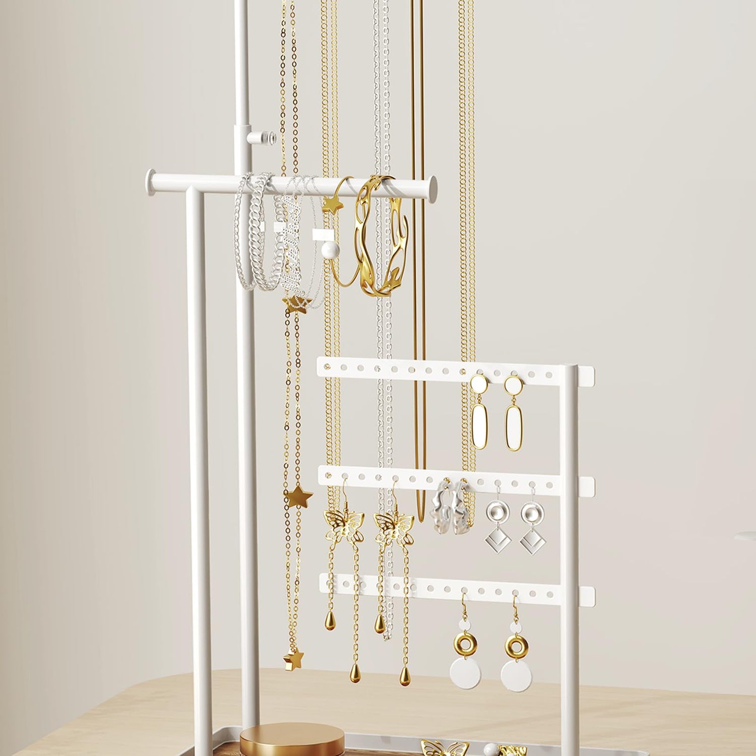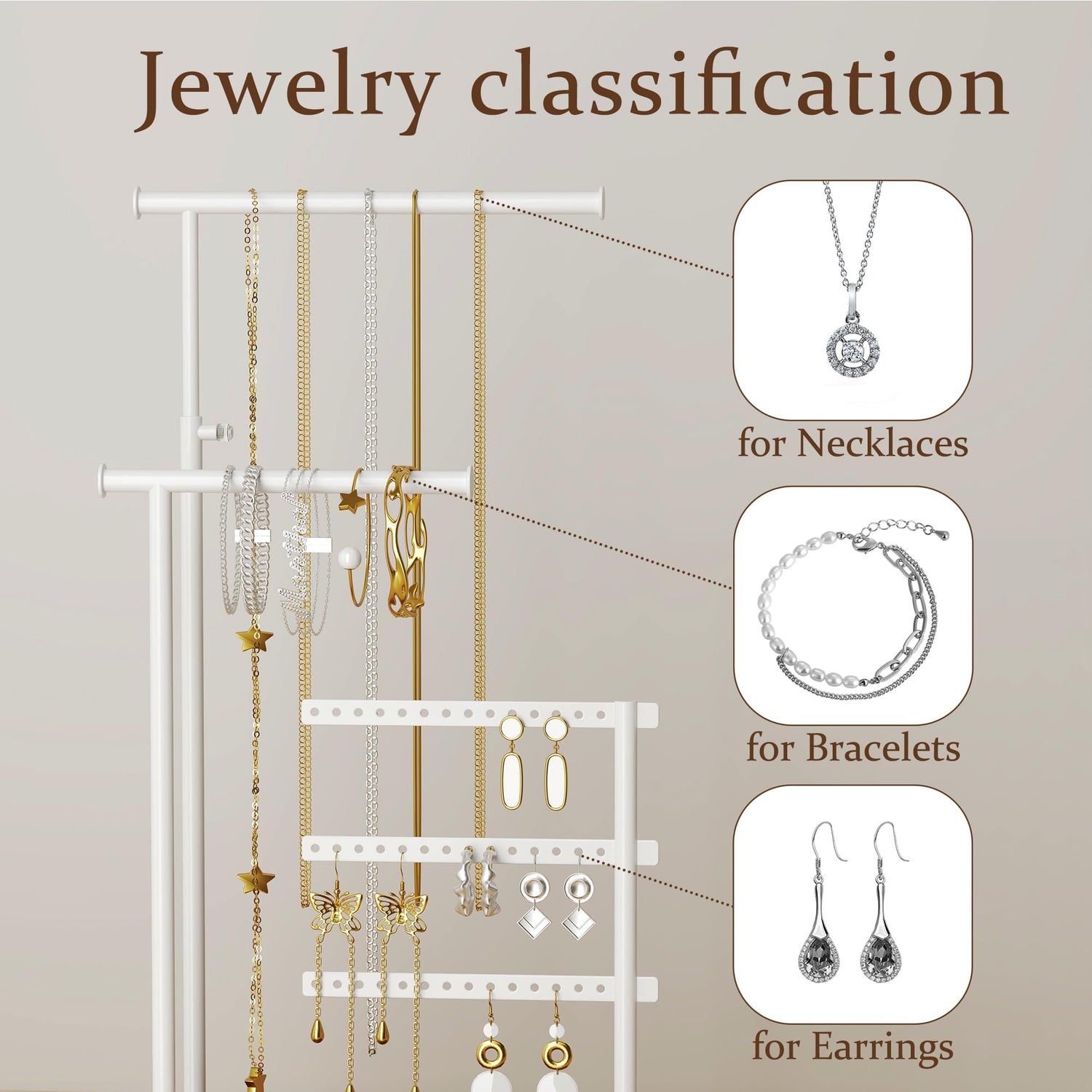 susswiff Jewelry Holder Organizer Stand - Adjustable Tall 17.5" (Max), Sturdy Jewelry Hanger for Necklaces, Earrings, Bracelets, Rings, Jewlery Display and Storage, White, Metal