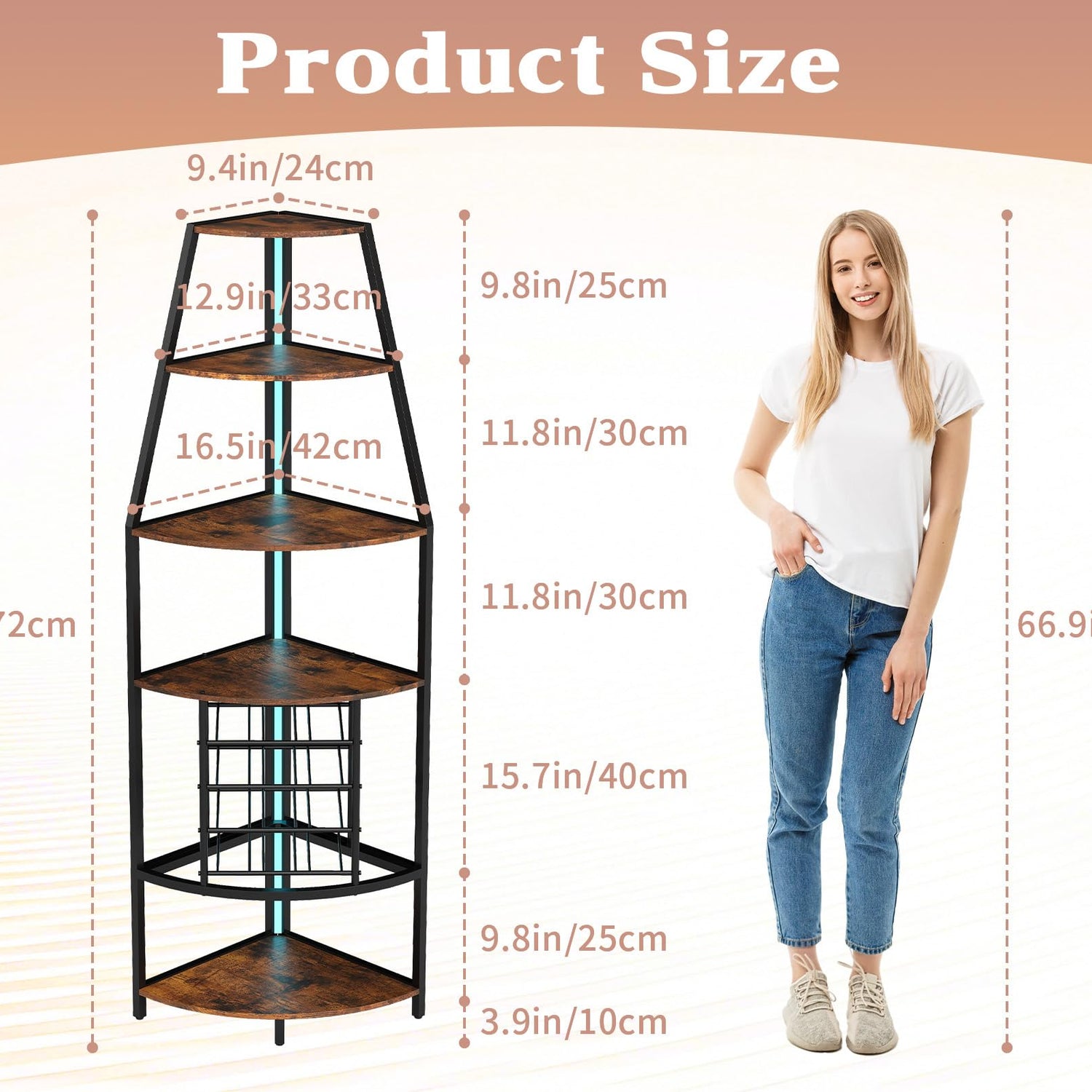 - Space-Saving Corner Design with Ample Storage:This floor-standing corner wine rack occupies minimal space and fits perfectly in any corner. It features 6-tier shelves providing ample space for storing wine buckets, drinks, trays, dishes, condiments, and other kitchen supplies. The grid shelf holds 18 wine bottles horizontally, keeping wine fresh longer. The glass holder can accommodate 6~8 glasses, making it a versatile storage solution for your home bar