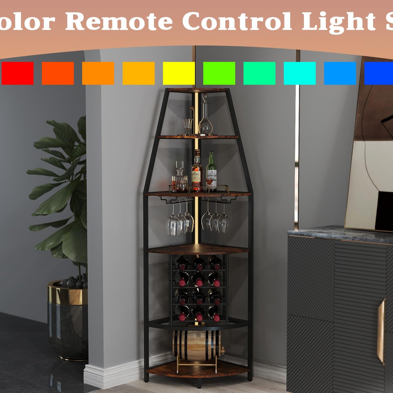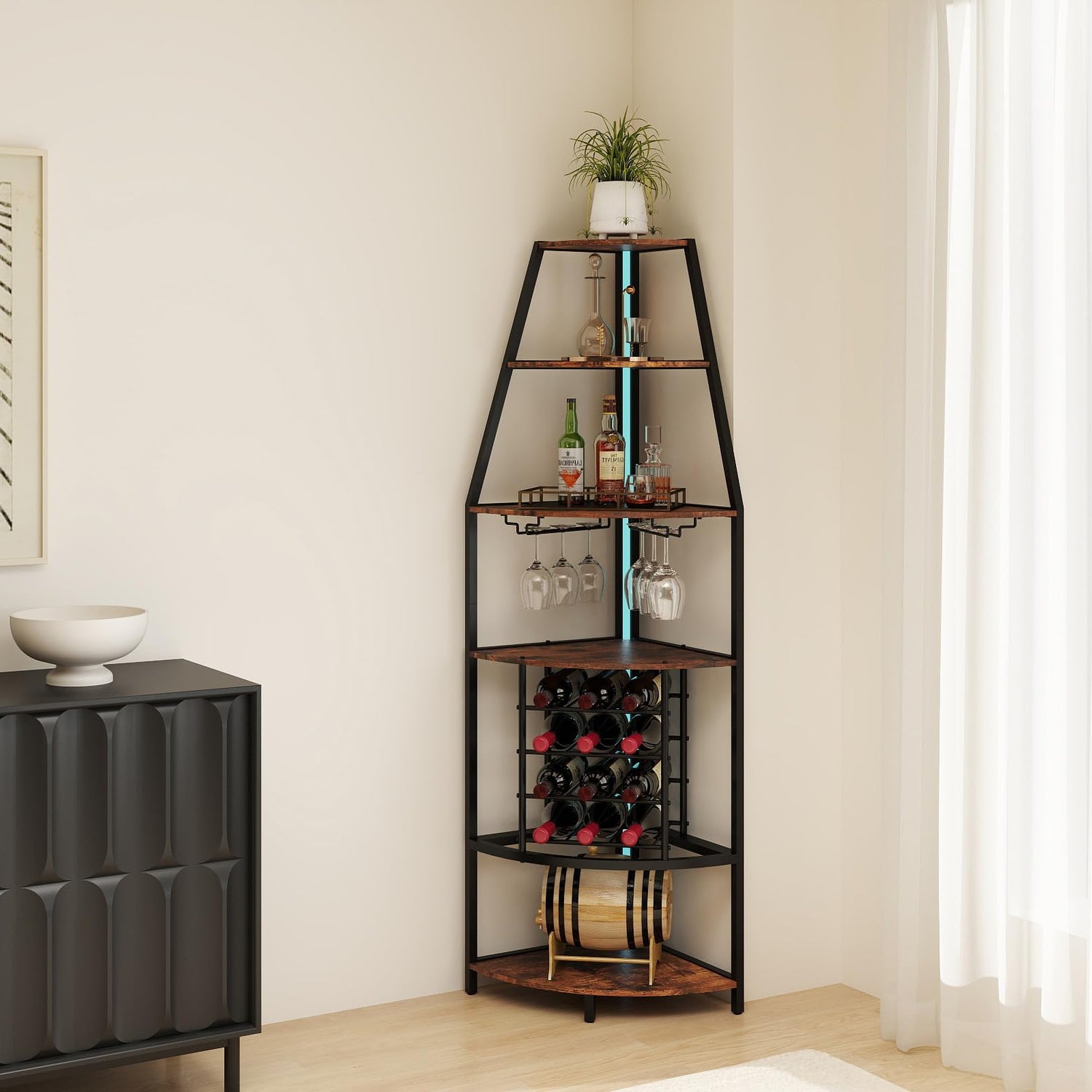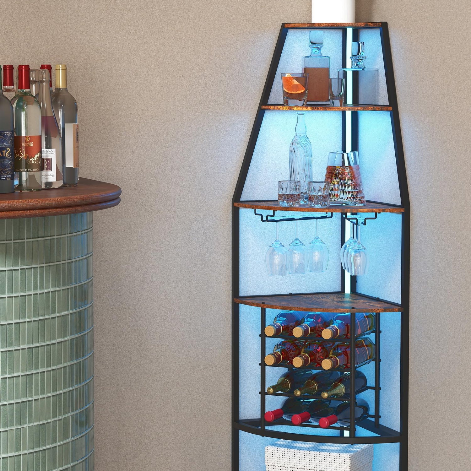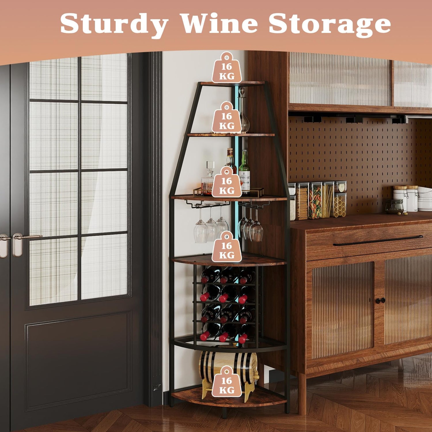Suuiwau 6-Tier Corner Wine Rack with LED Lights, Floor Standing Wine Storage with Glass Holder, Industrial Metal and Wooden Shelf for Kitchen, Living Room, Dining Room, Home Bar Furniture