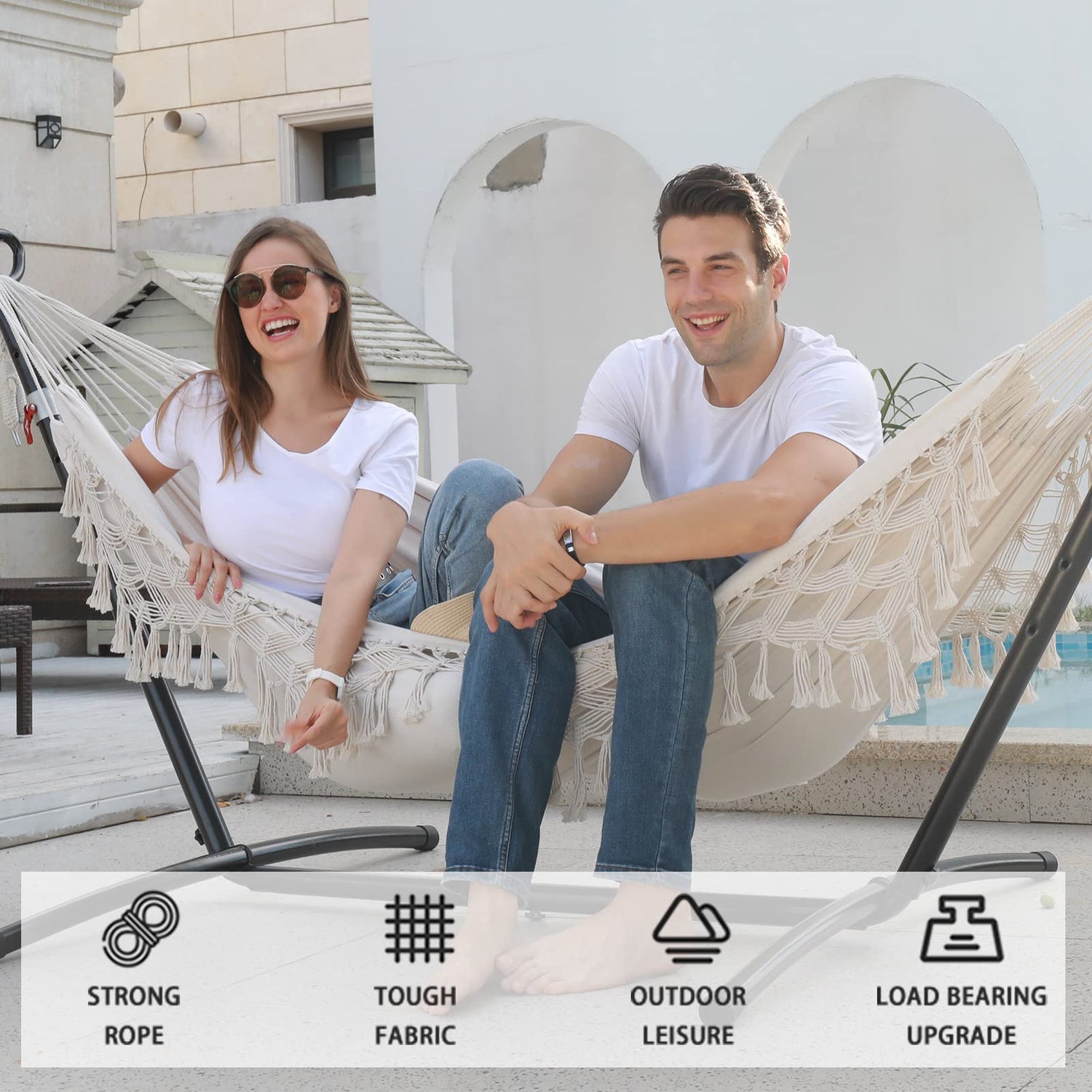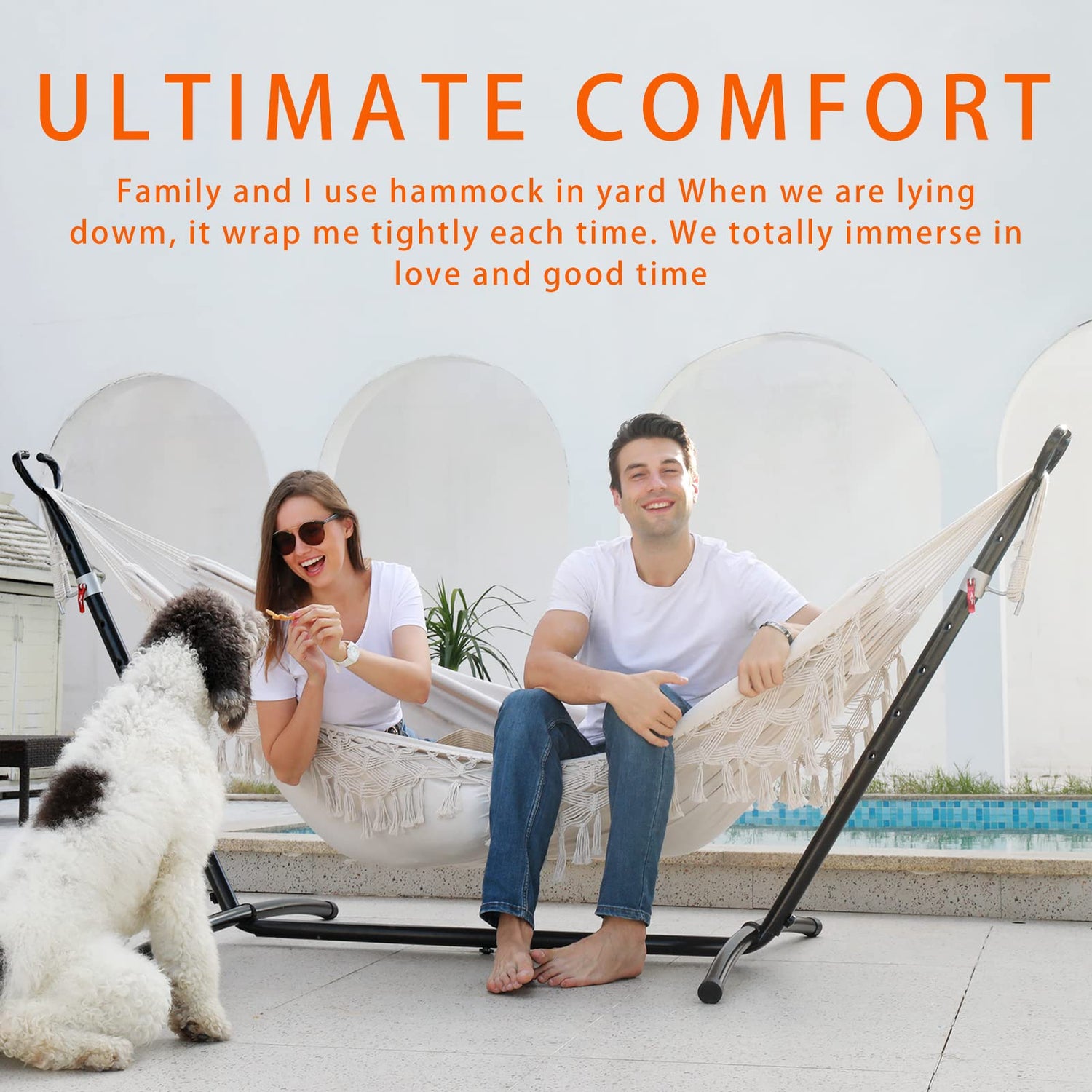 - ✅【Extreme comfort】The hammock is woven from cotton and polyester fabric for durability and extreme comfort and will not stretch or tear under pressure. In addition, this one also comes with two (crescent wood), which provides good support and comfort. The fringed lace on both sides is handmade, boho, romantic, and beautiful. Whether for personal use or as a gift, this is an excellent addition to any yard