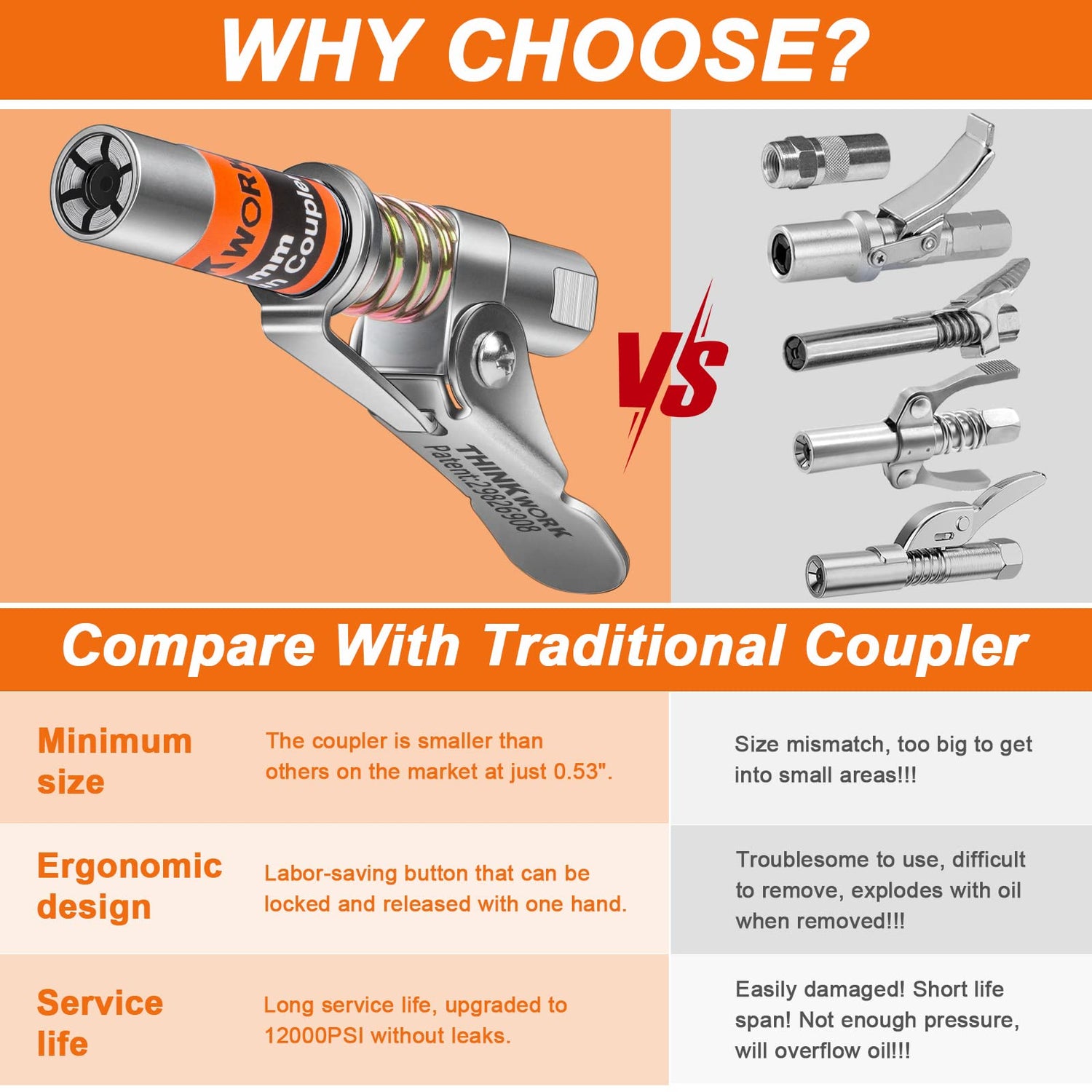 • Upgrade Locking & Sealing - With the exclusive patent in the United States, THINKWORK upgraded grease gun coupler adopts upgraded powerful patented 6-jaw structure. With reinforced jaws & high-quality aviation-grade sealing gaskets, Tested at 12000 PSI pressure also prevents leaks.