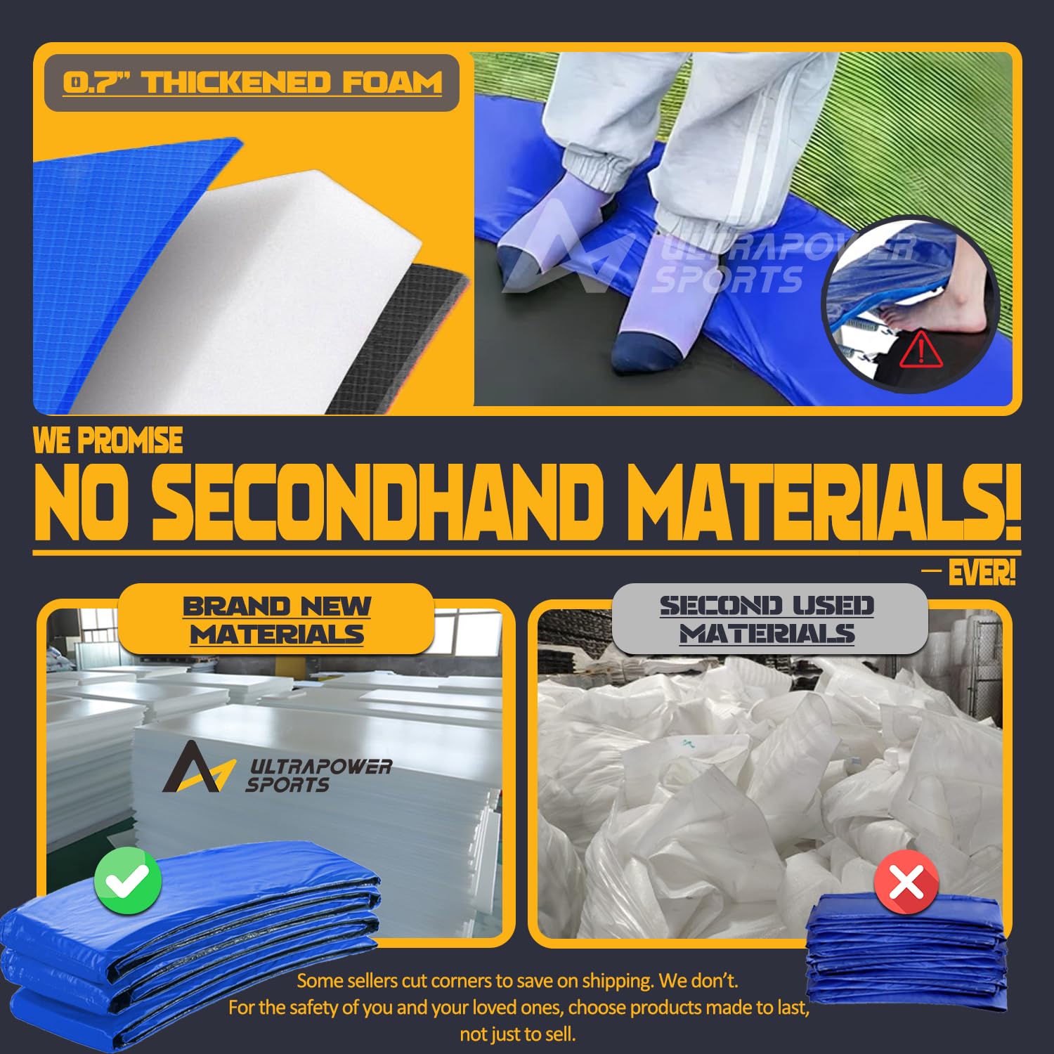 • 🏆️【Trusted Quality ULTRAPOWER SPORTS trampoline pad】 As a top-tier trampoline replacement mat brand, we prioritize safety and durability. We believe that you who appreciate quality will know how to choose wisely. The double industrial-grade stitching and triple-layer construction (PVC + PE + padding) outperform other flimsy covers. Whether replacing worn-out mats or upgrading old trampolines, choose our trampoline pad replacement that balances affordability with professional-grade performance.