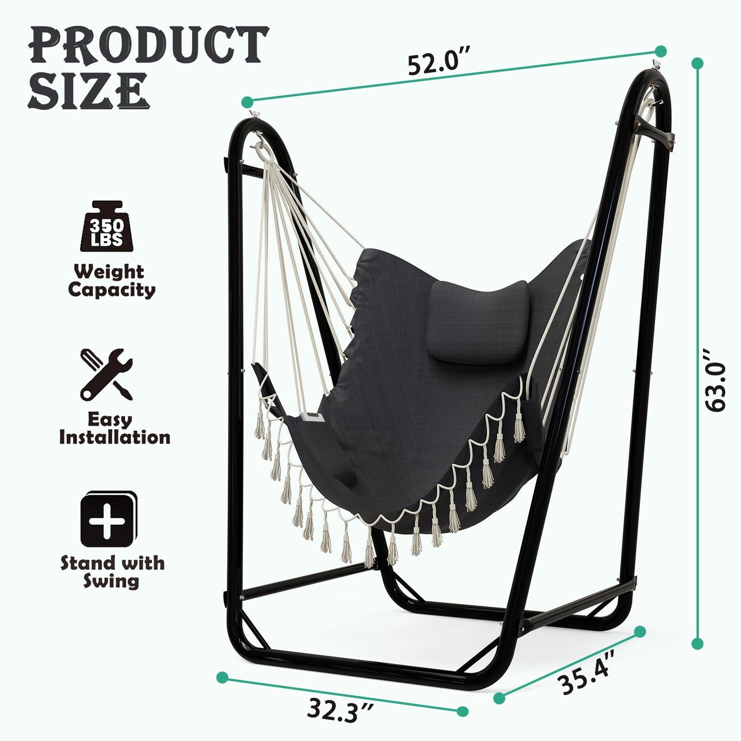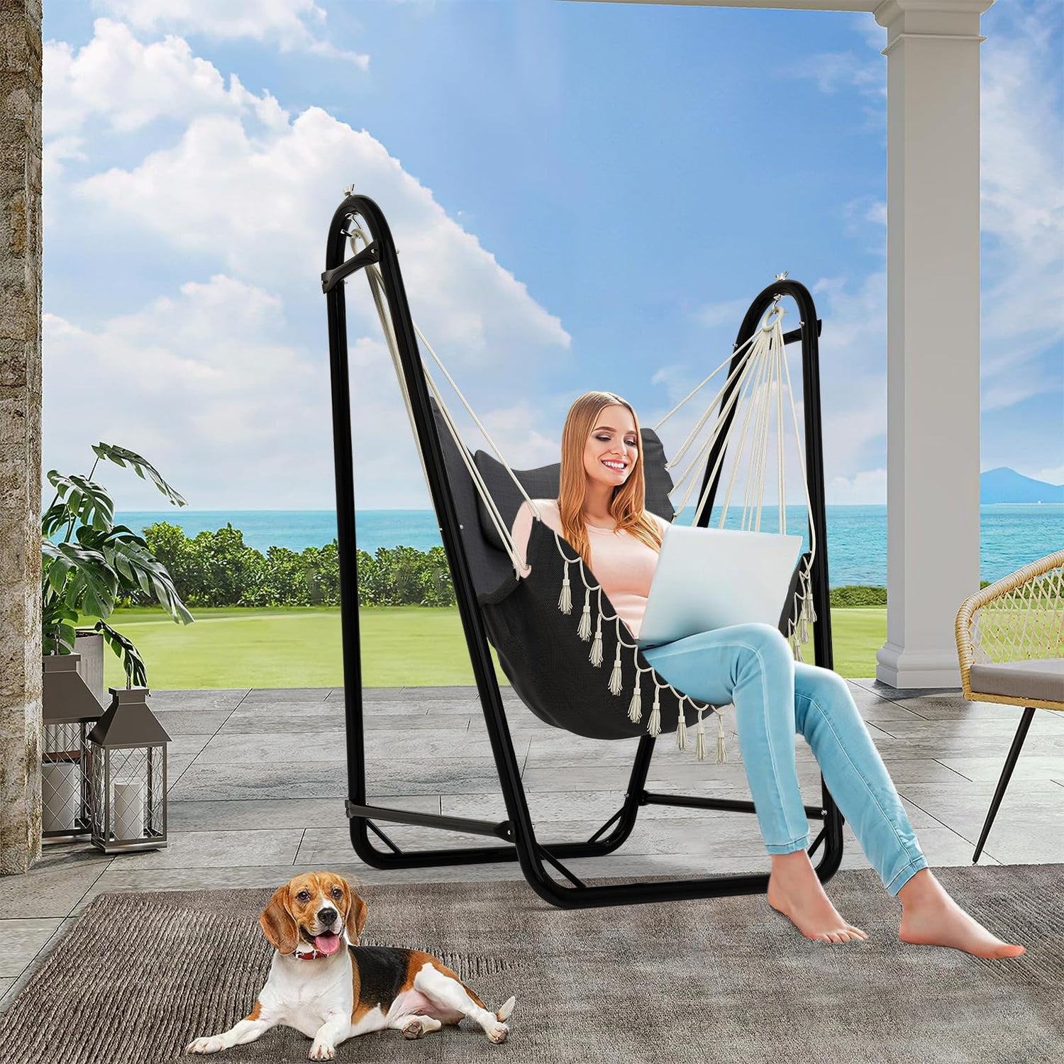 Unique U-Shaped Hammock Chair with Stand,Sturdy & Rust-Resistant,Free Gray Cotton Hammock Chair