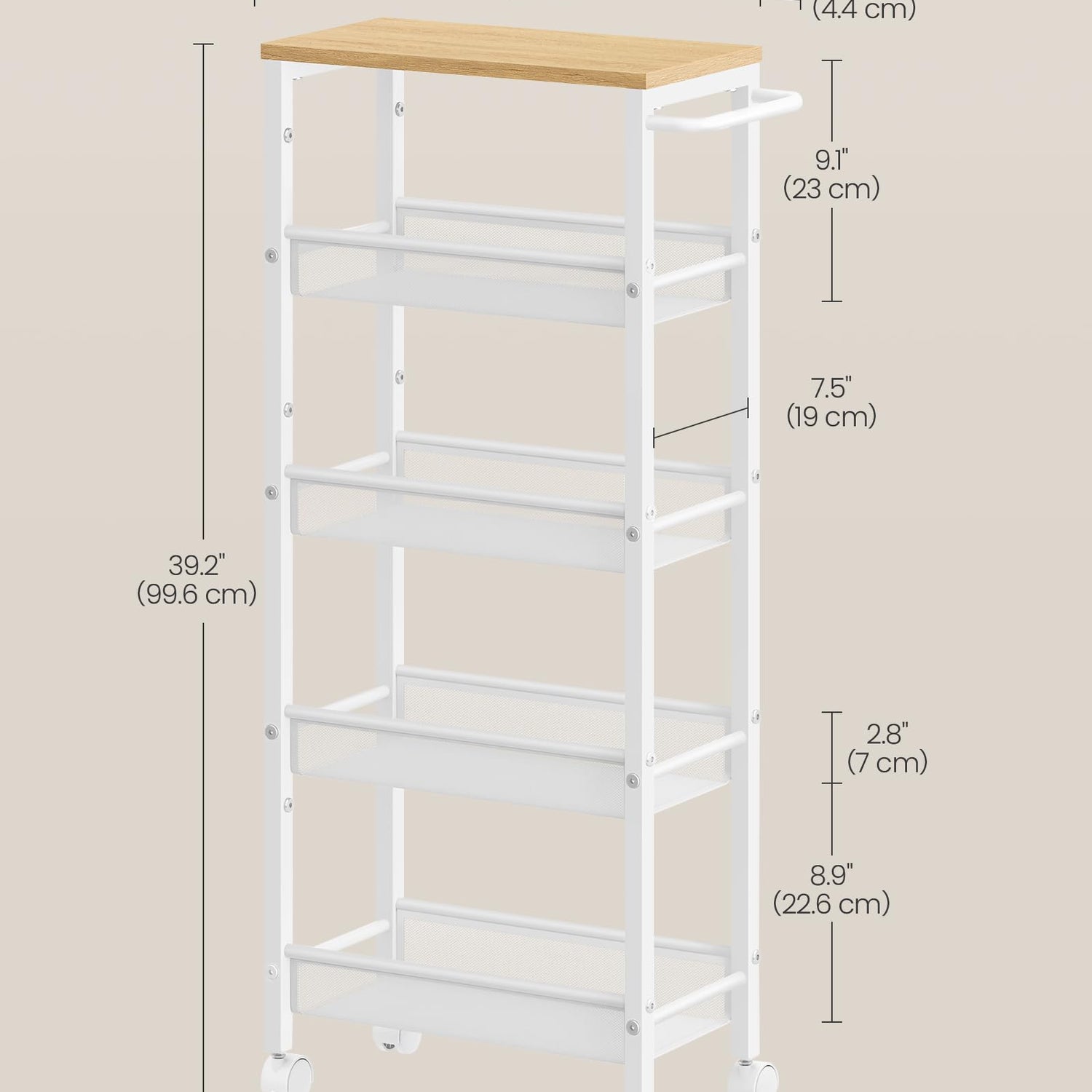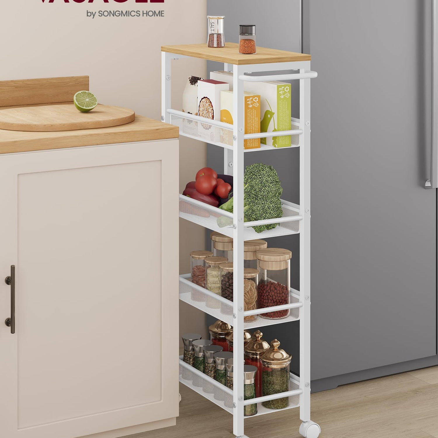 VASAGLE Slim Rolling Cart, 5-Tier Storage Cart, Narrow Cart with Handle, 8.7 Inches Deep, Metal Frame, for Kitchen, Dining Room, Living Room, Home Office, Oak Beige and Classic White ULRC035W09