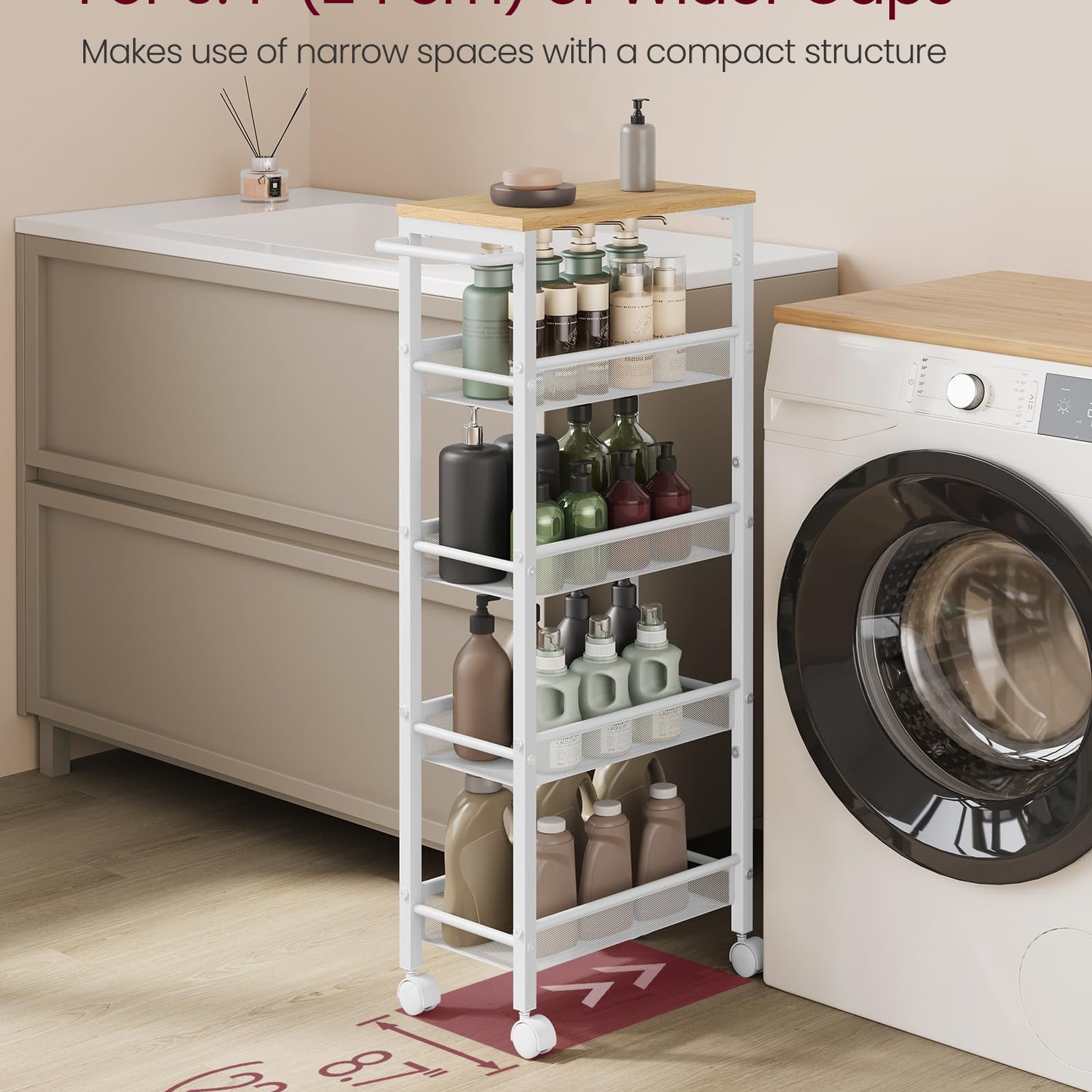 - 【STURDY AND DURABLE】Crafted with robust steel and quality particleboard, this slim storage cart is durable for years to come
