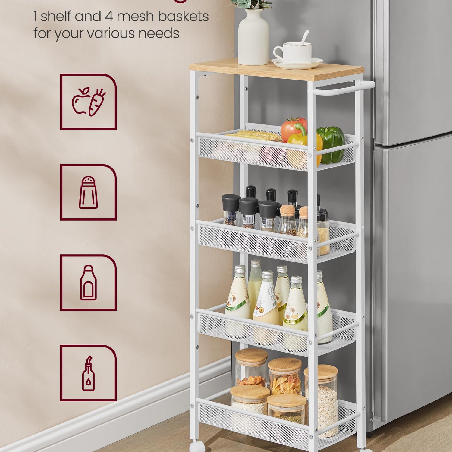 - 【5-TIER STORAGE】Set your most frequently used spice bottles on the top shelf, and store the coffee bean jars and snacks in the 4 storage baskets below—5 shelves offer oodles of space