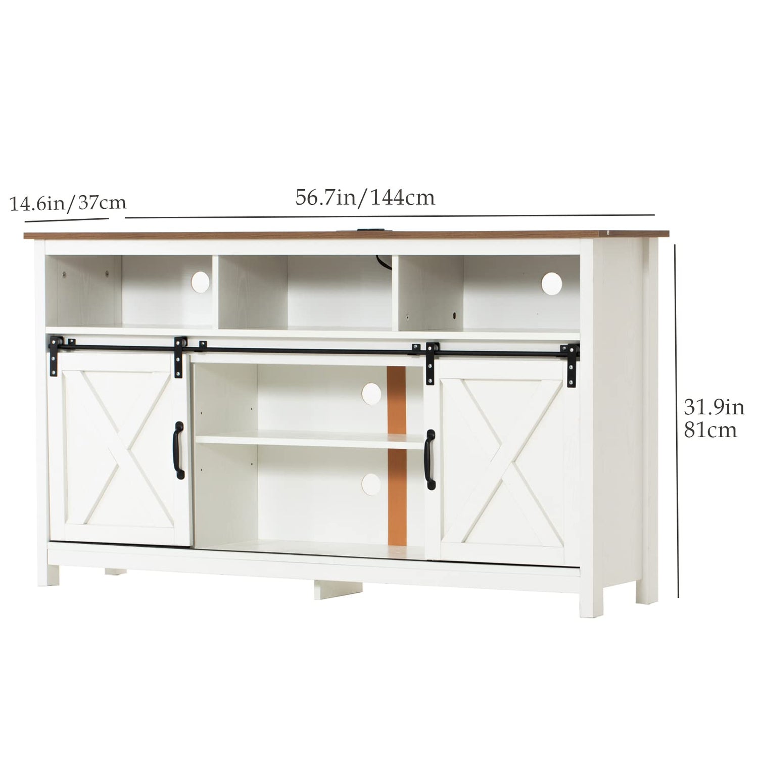 Vinctik 6&Fox 57” Wooden Farmhouse TV Stand for 60/65 inch TV,Double Layer Storage Entertainment Center TV Console Table,w Double-Row Sockets and 2 Sliding Barn Door,Media Cable Box(White)