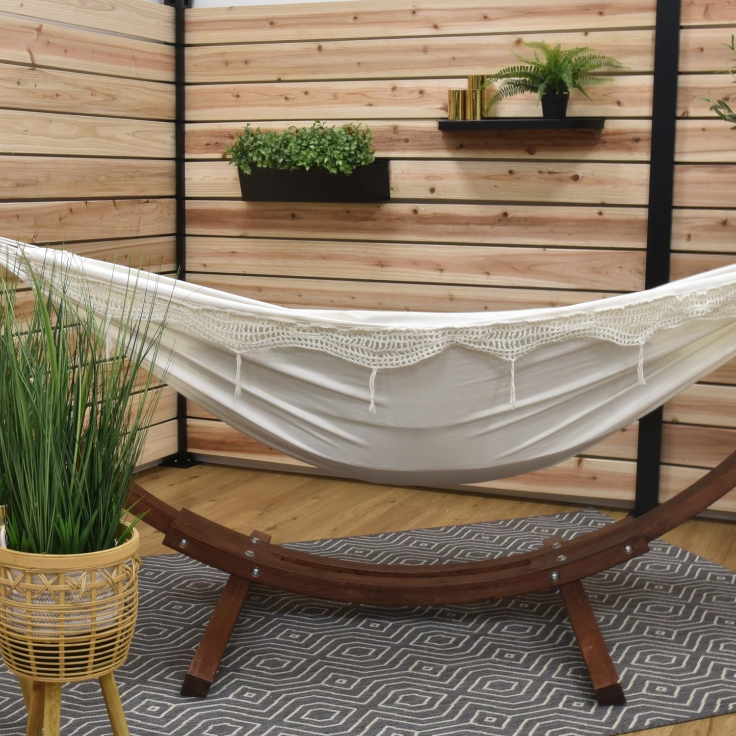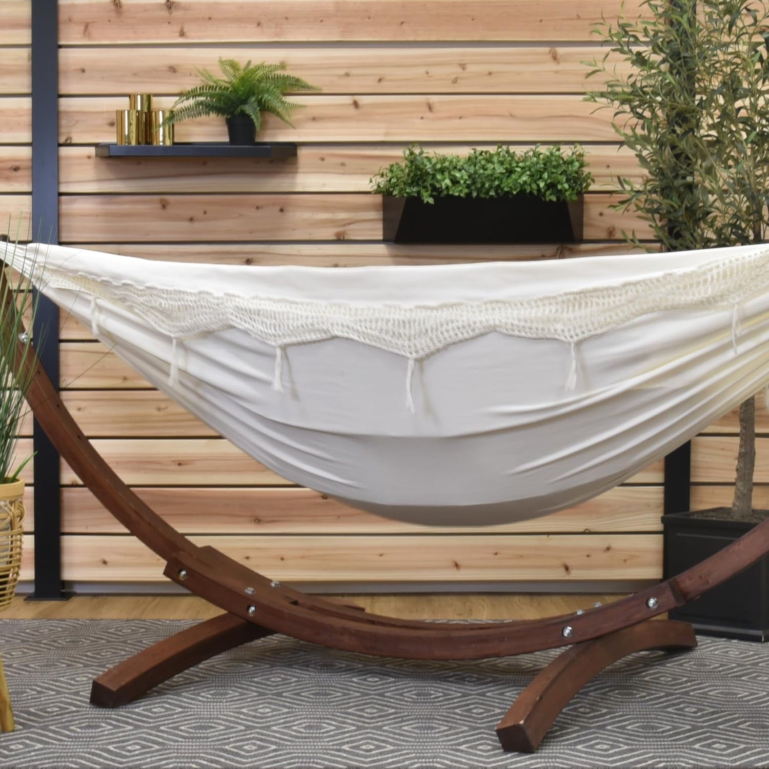 Vivere Double Cotton Hammock with Solid Pine Arc Stand - 450 lb Capacity, Durable FSC Wood Frame, Includes Hardware & User Guide - 450 lb Weight Capacity