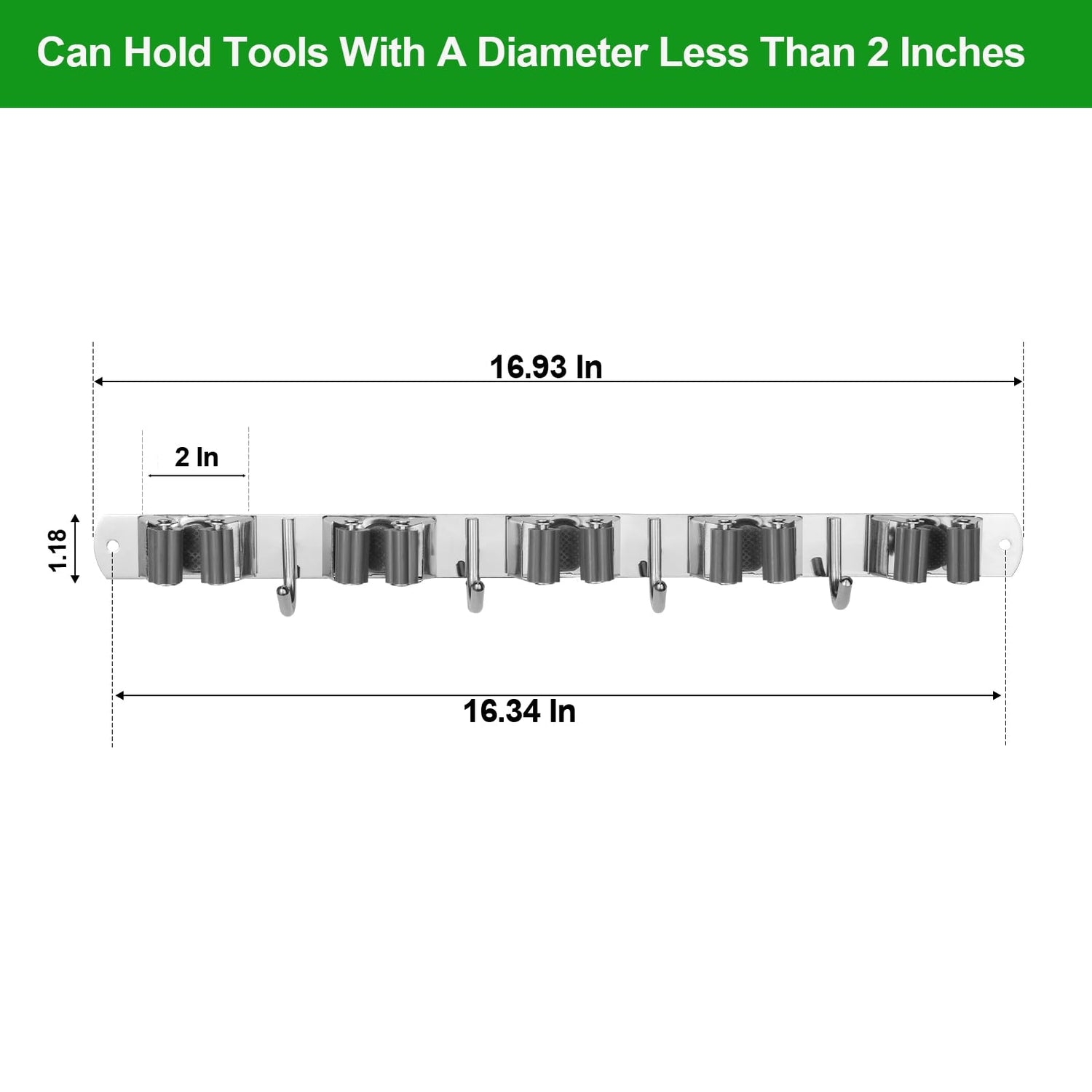 - [Sturdy & Non-slip] The broom and mop holder wall mount with 5 slots and 4 hooks is made of rust-proof 304 stainless steel, which is beautiful and much more durable than plastic materials, It's non-slip high elasticity clips can holds your broom, mop, umbrella or other garage tools firmly. You can install the tool storage rack with self-adhesive or screws to mount on the wall.