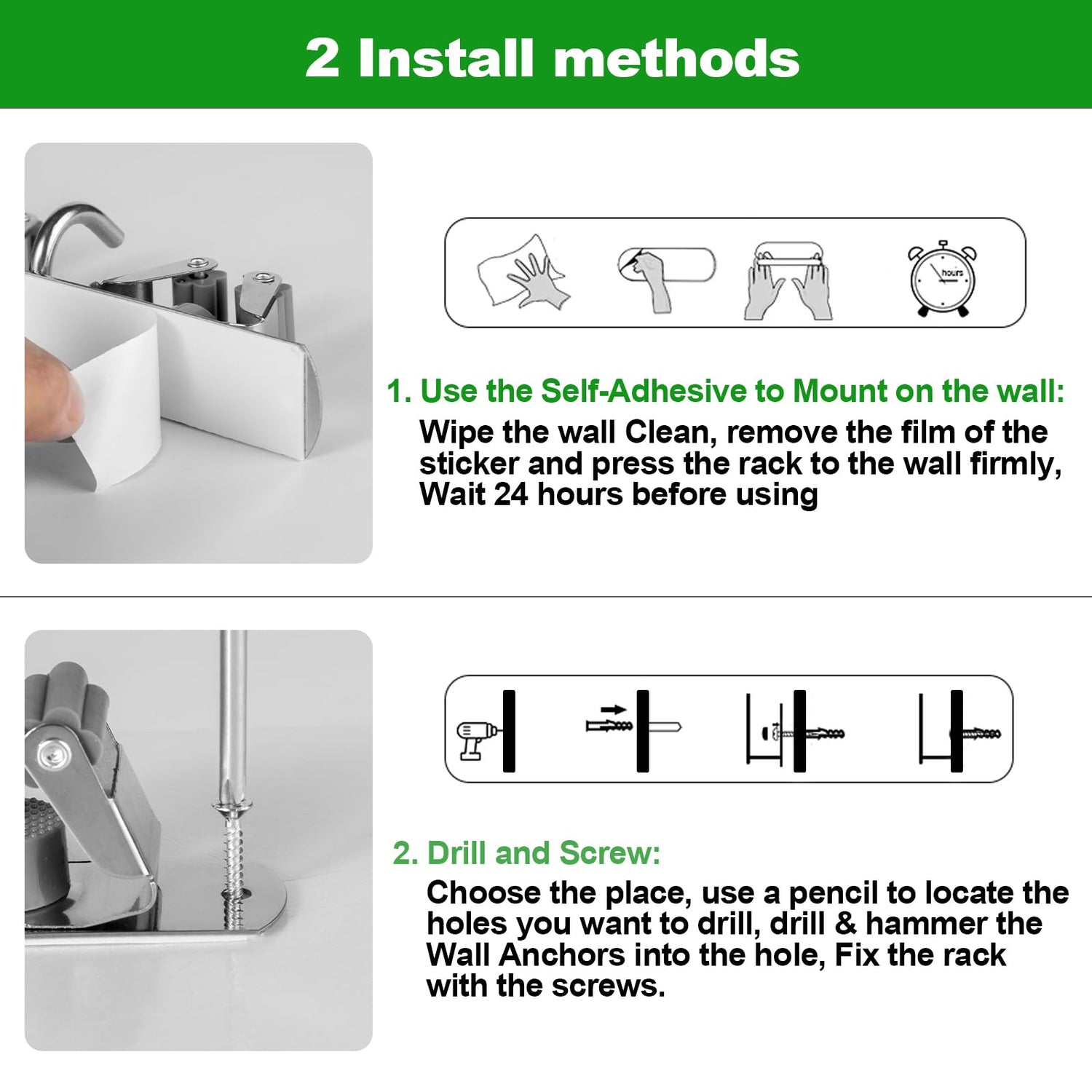 - [Easy to install] There are 2 methods to install this garage & house keeping tools storage system. 1, When the wall is ceramic tiles, metal, marble, glass, wood with smooth surface, you can use the self-adhesive tape to install, just tear off the protective film of the adhesive and stick it to the wall you want, push the broom rack to mount on the wall and wait for 48 hours till the utility racks are sticking firmly. 2, When the wall is not smooth or you want to use the storage rack outdoors, You can drill and use the screw to install or using the tape and screws together.