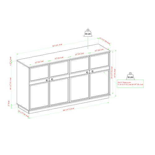 Details: Add a touch of timeless design to your home with this modern transitional sideboard. Framed door fronts and a smooth veneer finish provide a traditional aesthetic to elevate your living room, dining room, or home office. Tuck stemware, movies, or towels behind the four doors with adjustable soft close hinges for a clean atmosphere that you and your guests can enjoy. Create a cozy home theater by placing a TV up to 70 inches on the wide top. You can trust the warp-resistant MDF wood frame to protect your prized possessions held by this sophisticated TV stand.