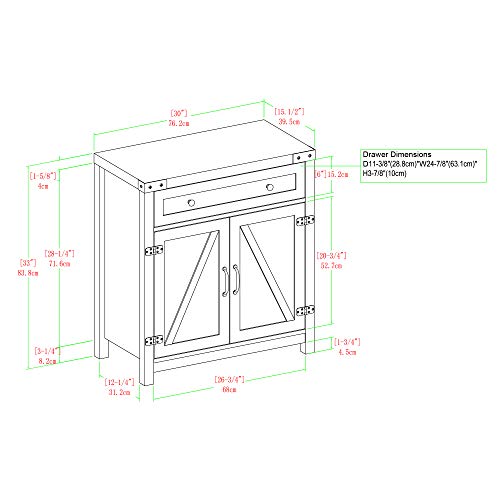 Details: This 30-inch farmhouse accent cabinet is full of closed storage options since it comes with two-doors and a drawer with telescoping metal drawer glides. Behind the doors there is an adjustable shelf. The exposed hardware and handles feature an antique bronze metal finish that enhance the rustic tone of this storage unit.