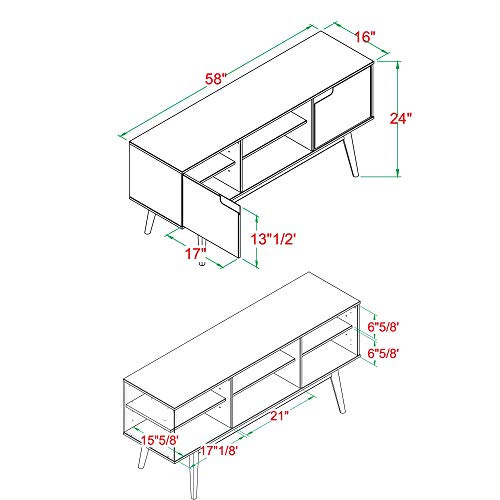 Details: Gather your family around to watch your favorite throwbacks around this Mid-century modern TV stand. Cutout handles offer easy opening of the two doors with adjustable soft-close hinges and provide a simple, modern aesthetic to your living room. Tapered angled legs enhance the entertainment console’s retro vibes. Make movie nights easier with media components on the two adjustable shelves or the center open fixed shelf. You’ll love the solid pine wood build because of its long-lasting quality.
