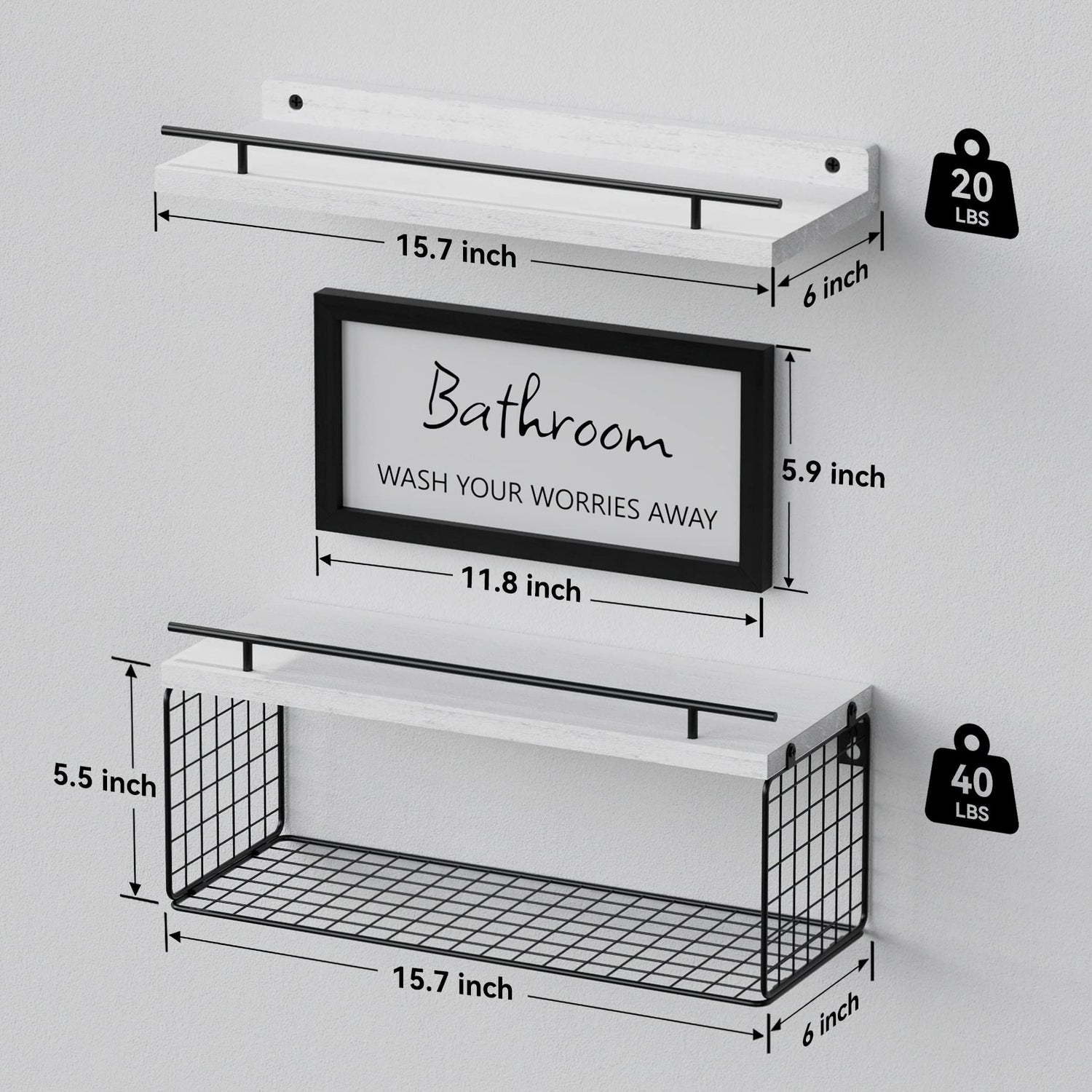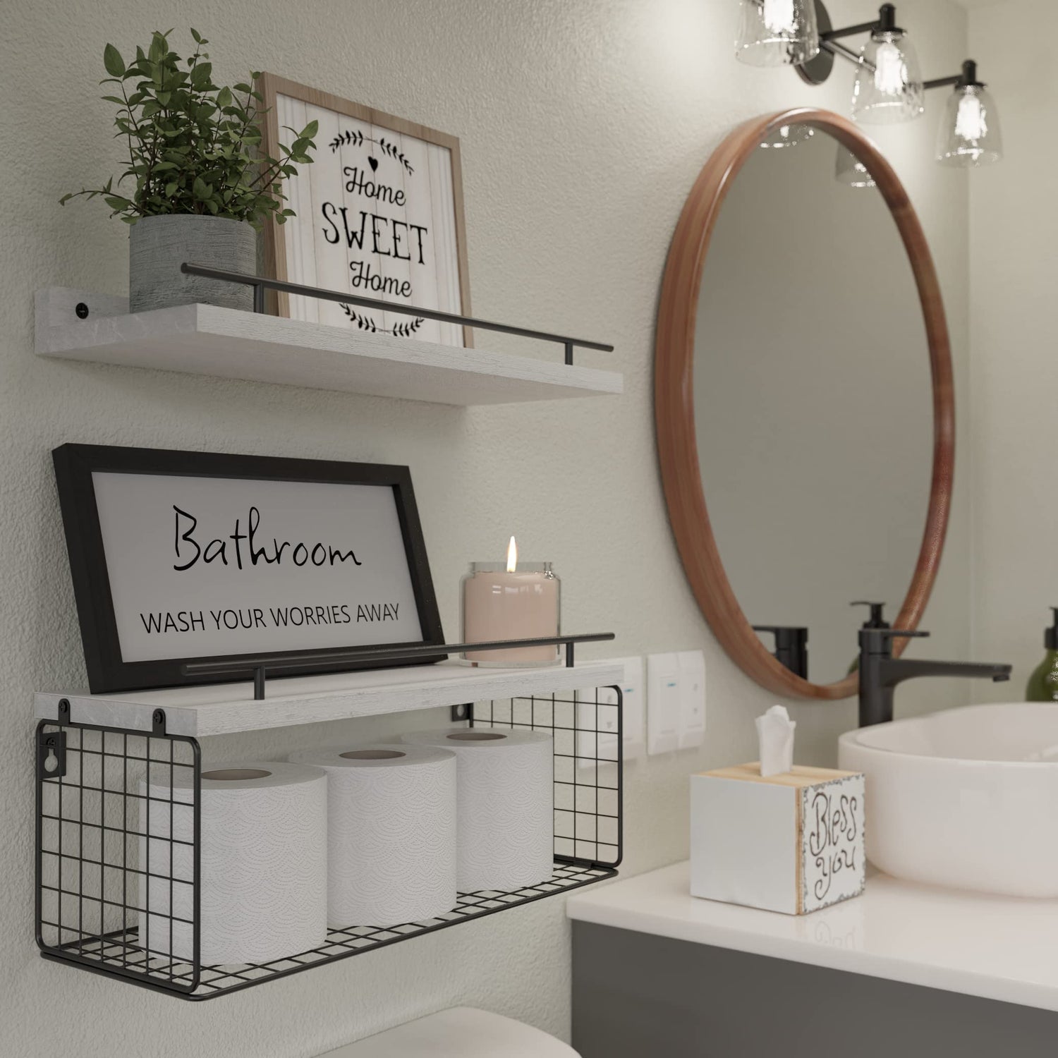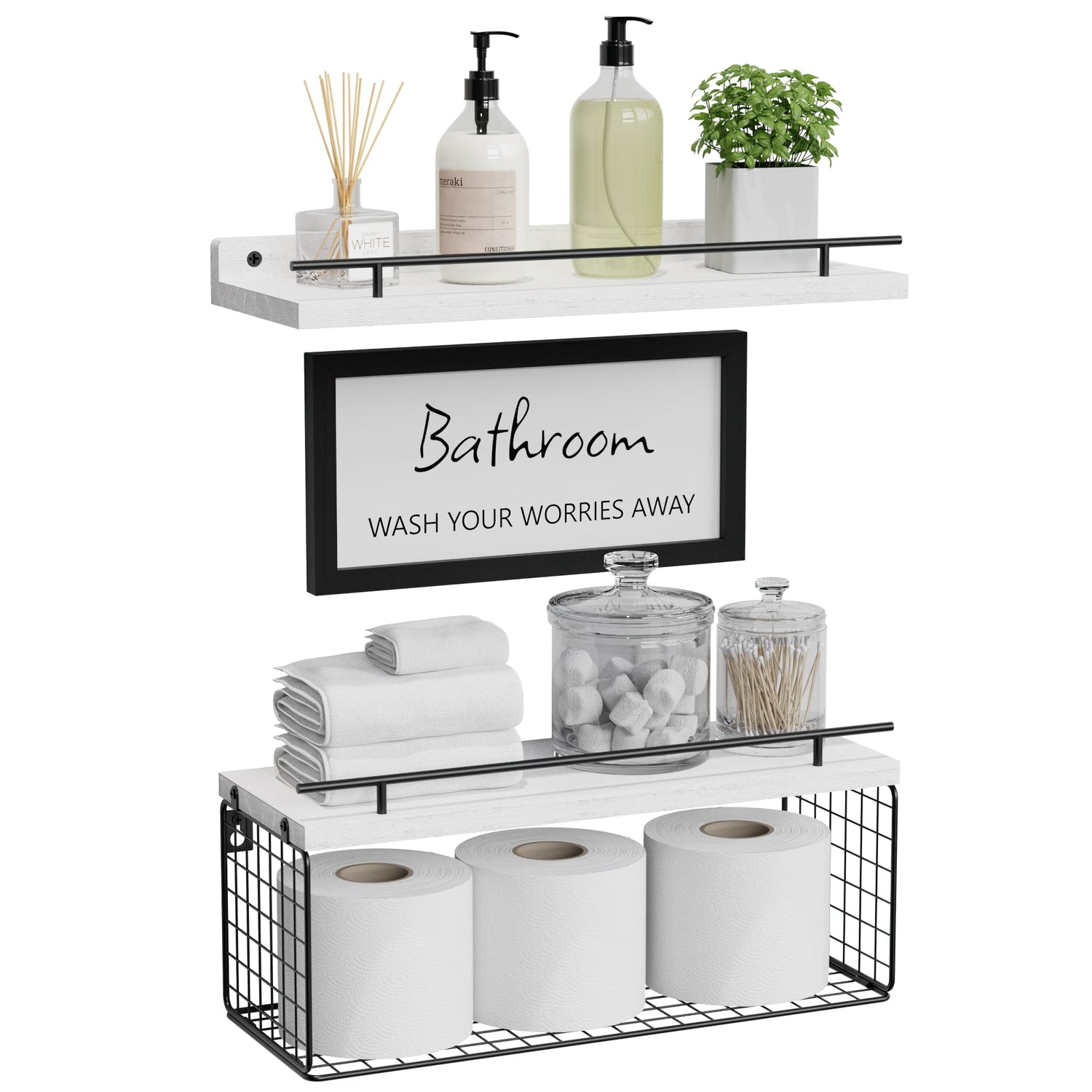 - Bathroom Wall Décor 3 Set - Farmhouse Style Combination – WOPTUES Farmhouse style black bathroom wall décor sets included: wall bathroom sign & floating bathroom shelves with guardrail & bathroom floating shelves with basket . Storage your bathroom, but not just storage. Let’s make your bathroom CUTE & RUSTIC. Add a funny touch to your half bath by using WOPITUES bathroom decor sets!