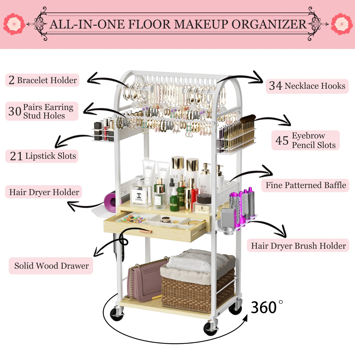 • 【Newest Floor Jewelry Organizer】This beauty trolley cart with wheels with open spaces and storage drawers is designed to keep the skin care products, cosmetics, makeup accessories, hair tools, bags organized and this jewelry display holder can store all kinds of jewelry while storing all kinds of hair accessories, head accessories,jewelry organizer drawer Give full play to the maximum utilization value of the product. It can be fixed beside bathroom vanity and bedroom dresser. The sleek and modern finish is an easy fit for home organization makeup storage organizer rolling cart