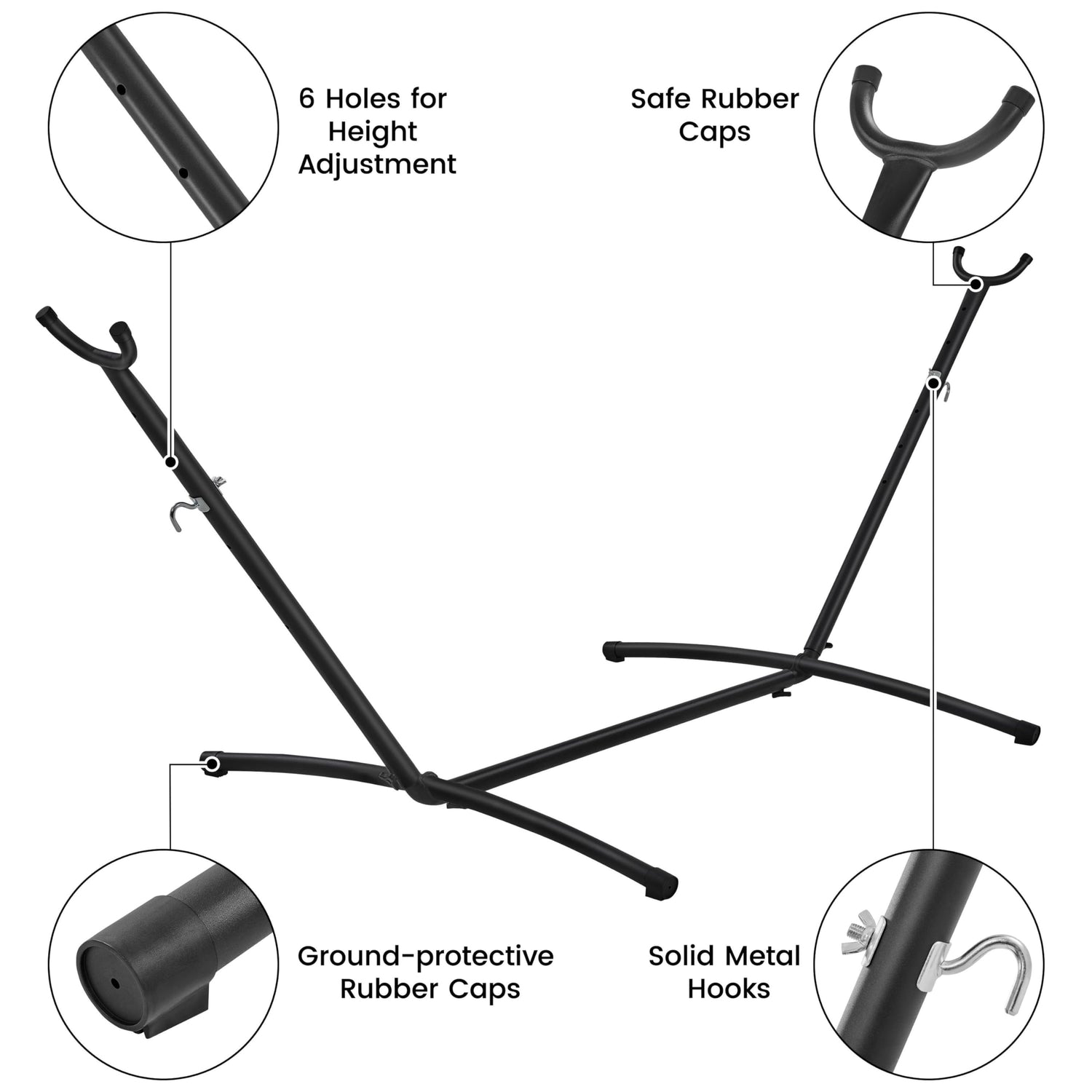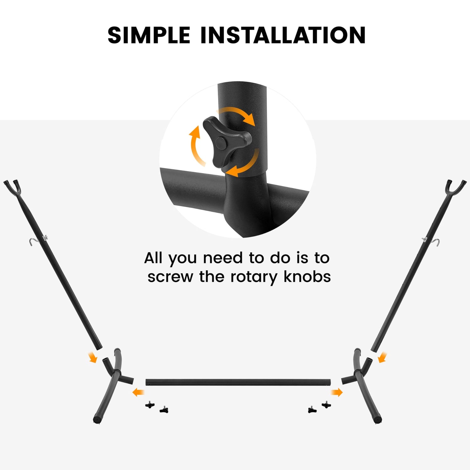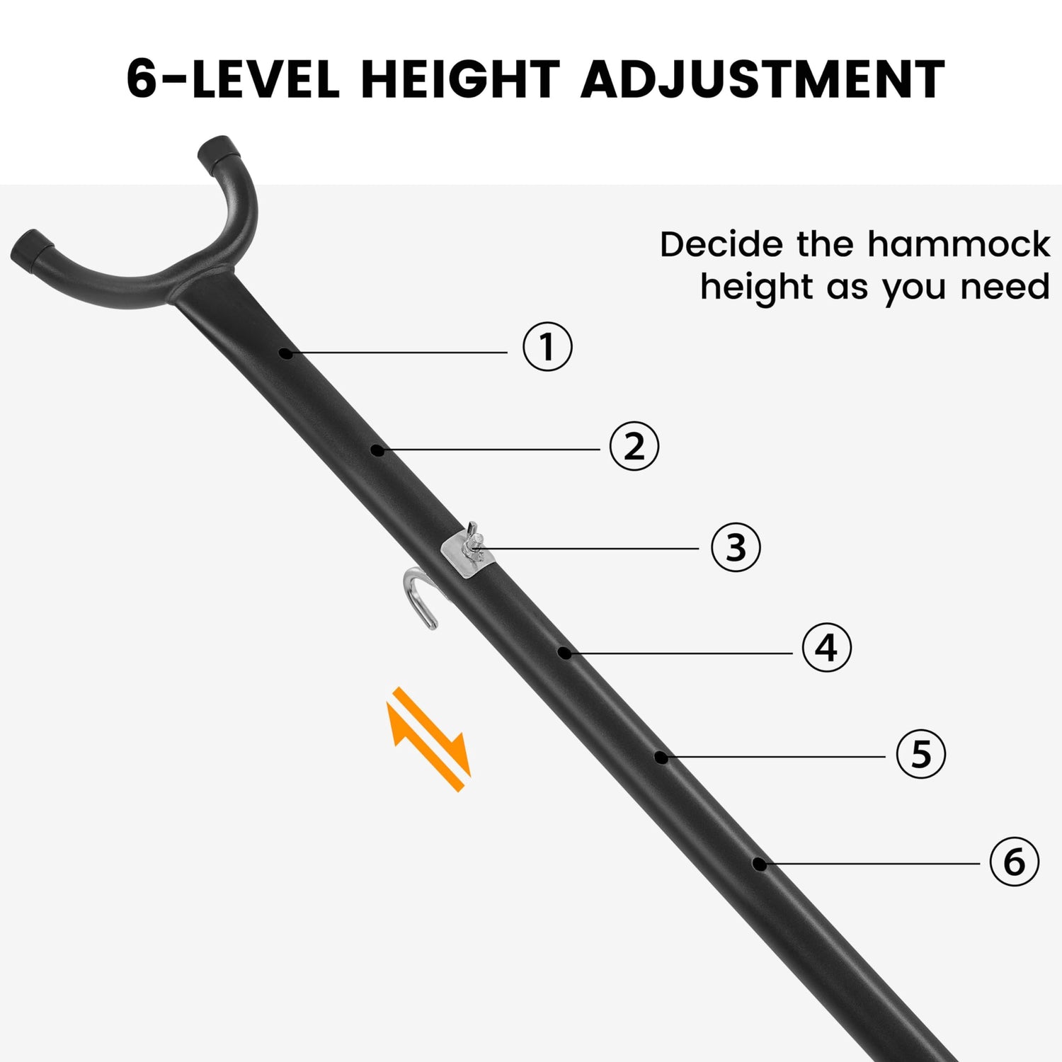 - Strong Hooks, Guaranteed Safety: Two Y-shaped hooks offer a super easy way to hang the hammock on the stand. Such a design allows this frame to support other hammocks of the suitable dimension