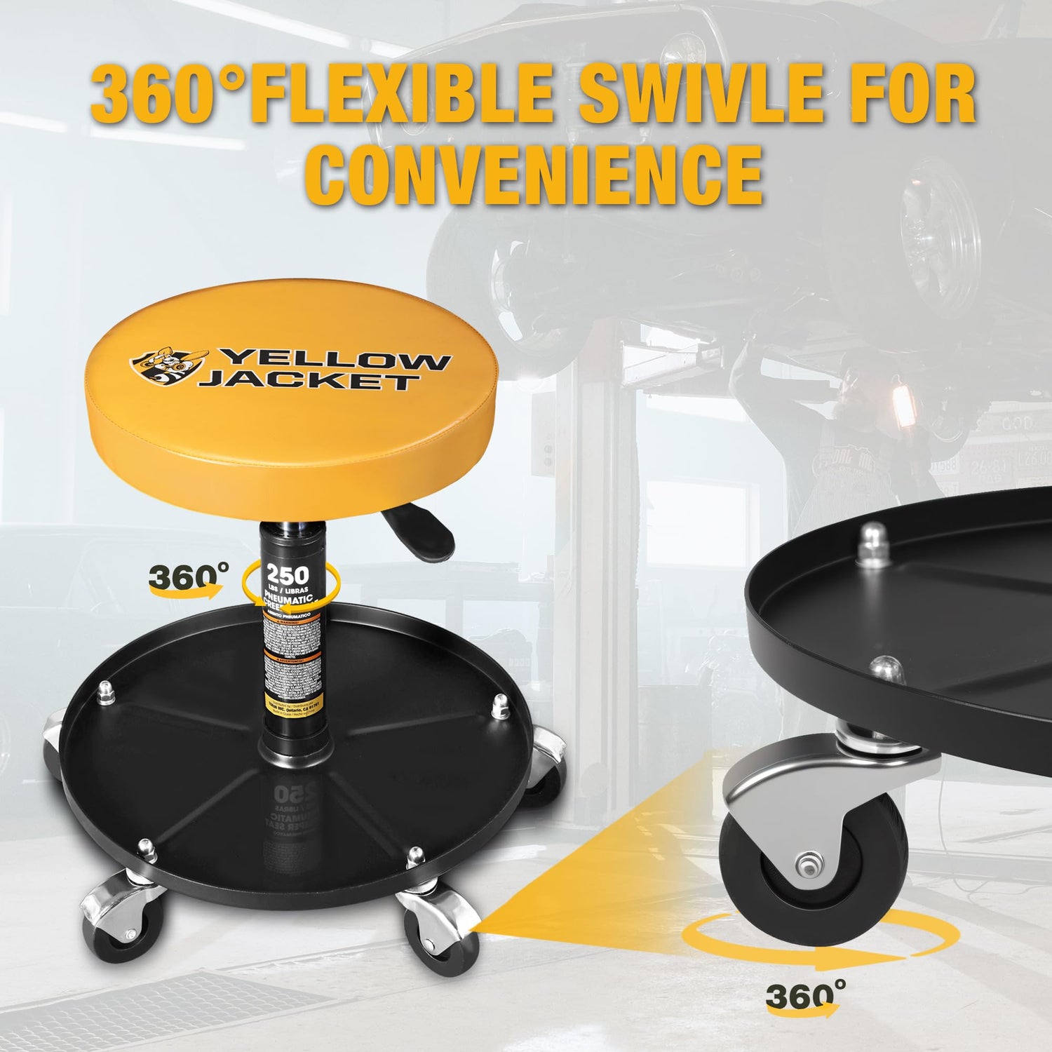 YELLOW JACKET Rolling Mechanic Stool with Wheels Pneumatic Garage Shop Seat Adjustable Height Roller Mechanics Creeper Chair with Tool Tray for Auto Repair