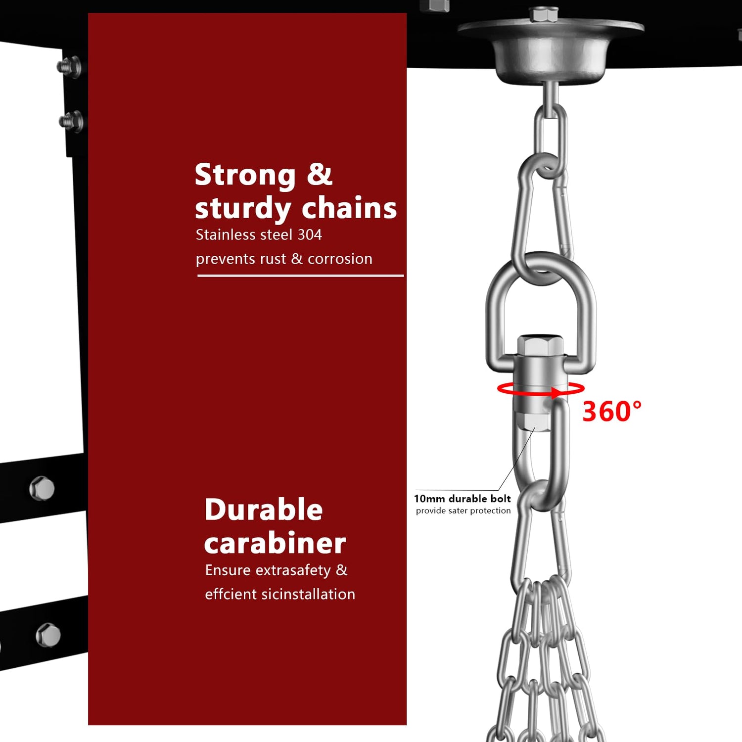 • 360° Smooth Swivel Action: The heavy bag hanger is designed a 360-degree rotating smooth swivel mechanism that allows the punching bag to rotate freely, minimising stress on the chain and providing a smoother, more comfortable training experience