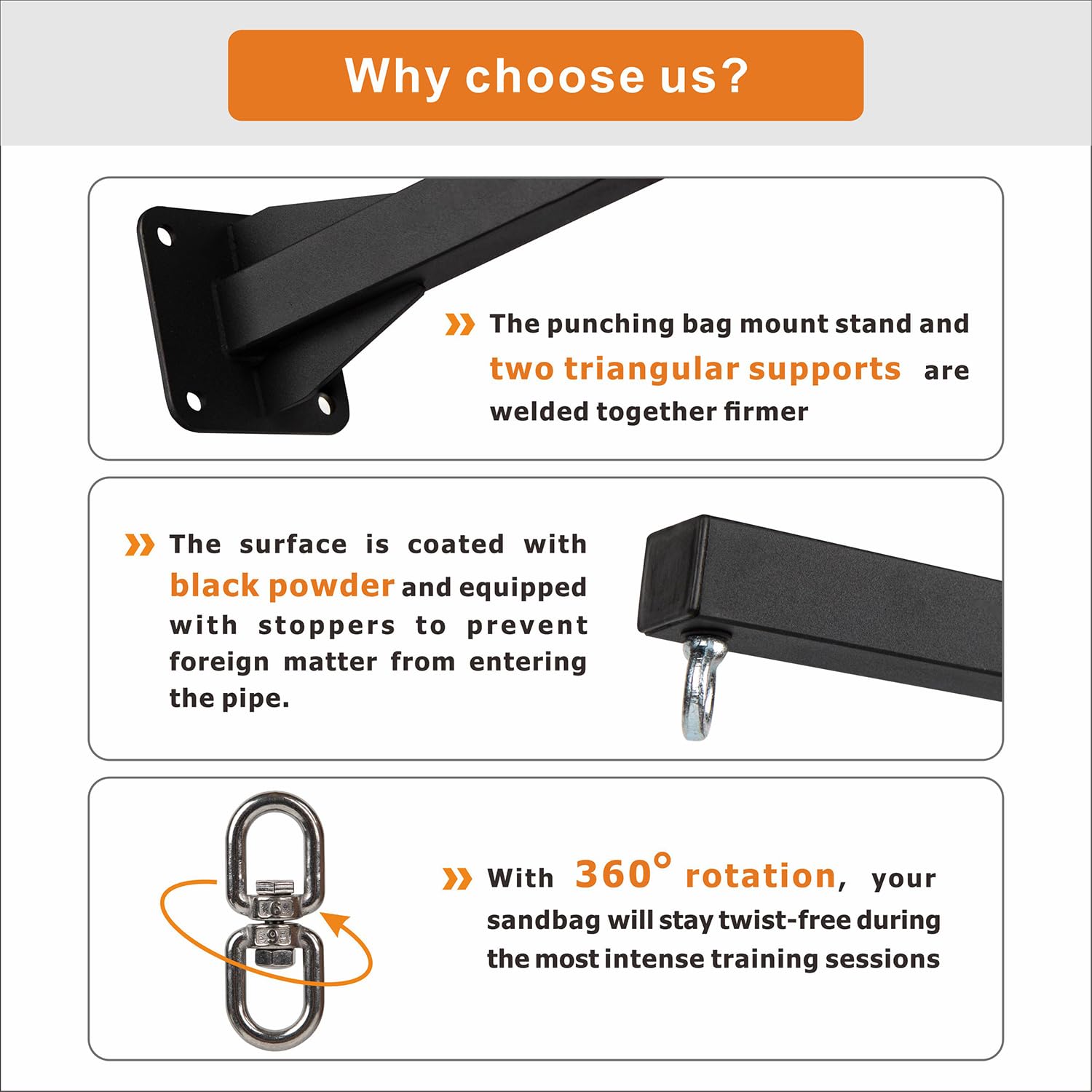 - 【Boxing Sandbag Hanger】This heavy bag mount has a solid and stable hanging function, 360° silent swivel hooks, and can carry up to 600lbs. Solid steel structure, safe and stable, easy to use, the best choice for boxing enthusiasts.