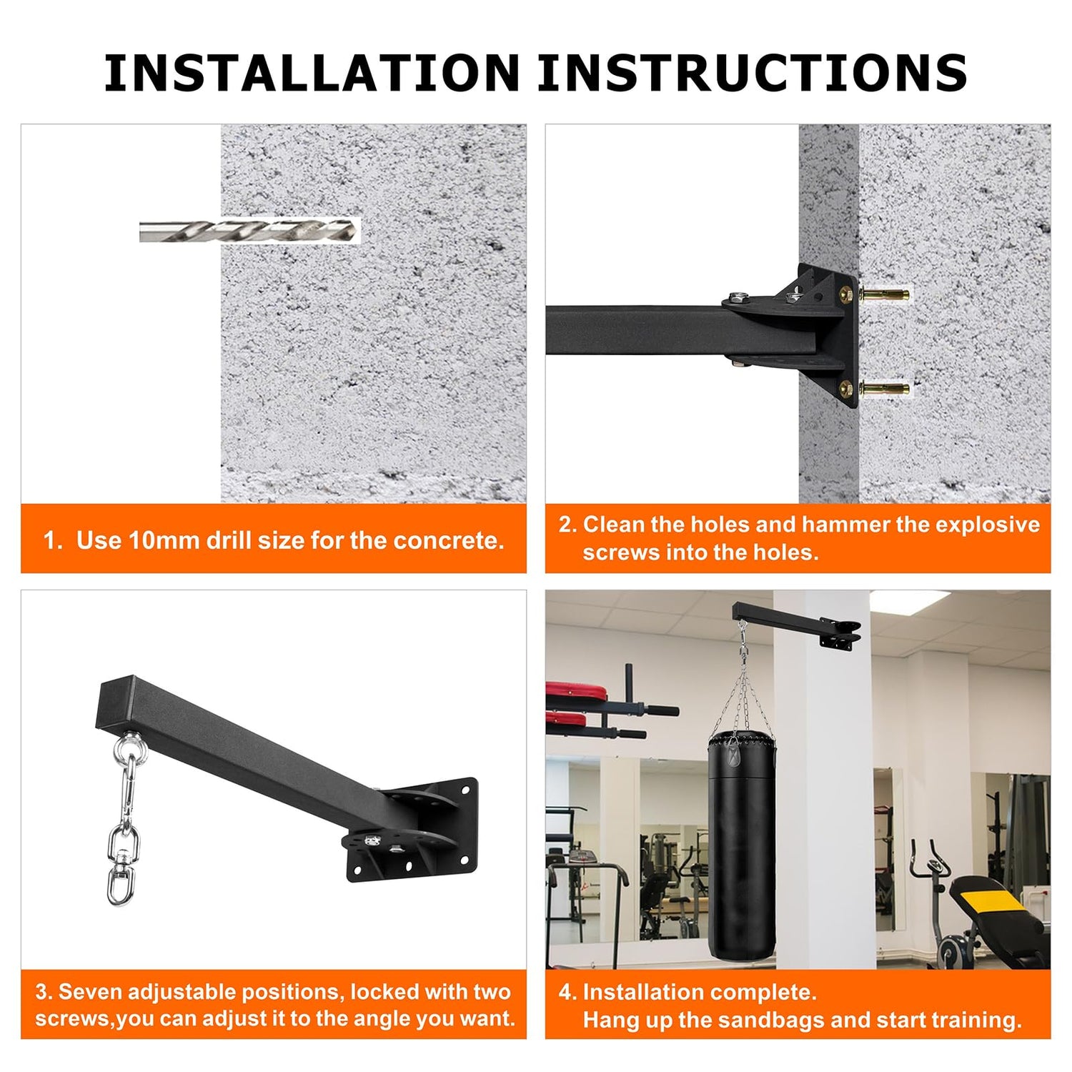 - Easy to install - Our punching bag holder come with 6 expansion bolts and a pins screw to adjust the Angle and a screw to lock the structure. A link nut, a rotating ring and a figure eight ring, simply hung on any concrete or wooden surface, can be installed in a few minutes.
