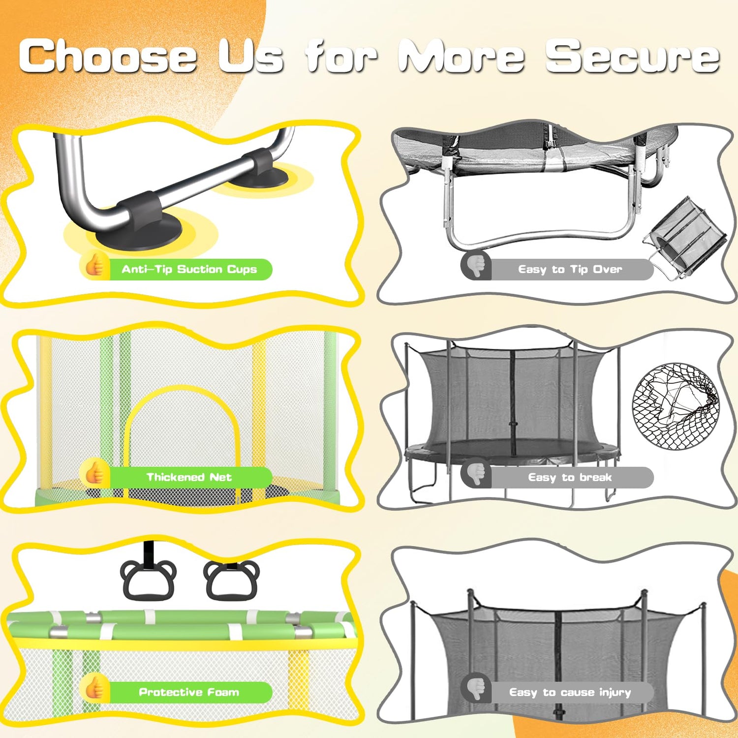 - Safe & Sturdy - Our indoor kids trampoline is built to last, with a thickened steel frame, 3 U-shaped legs with non-slip suction pads, and a 360° wrap-around safety pad. Plus, with dense safety netting and upgraded foam, it's a robust and secure space for your little ones to bounce and play.