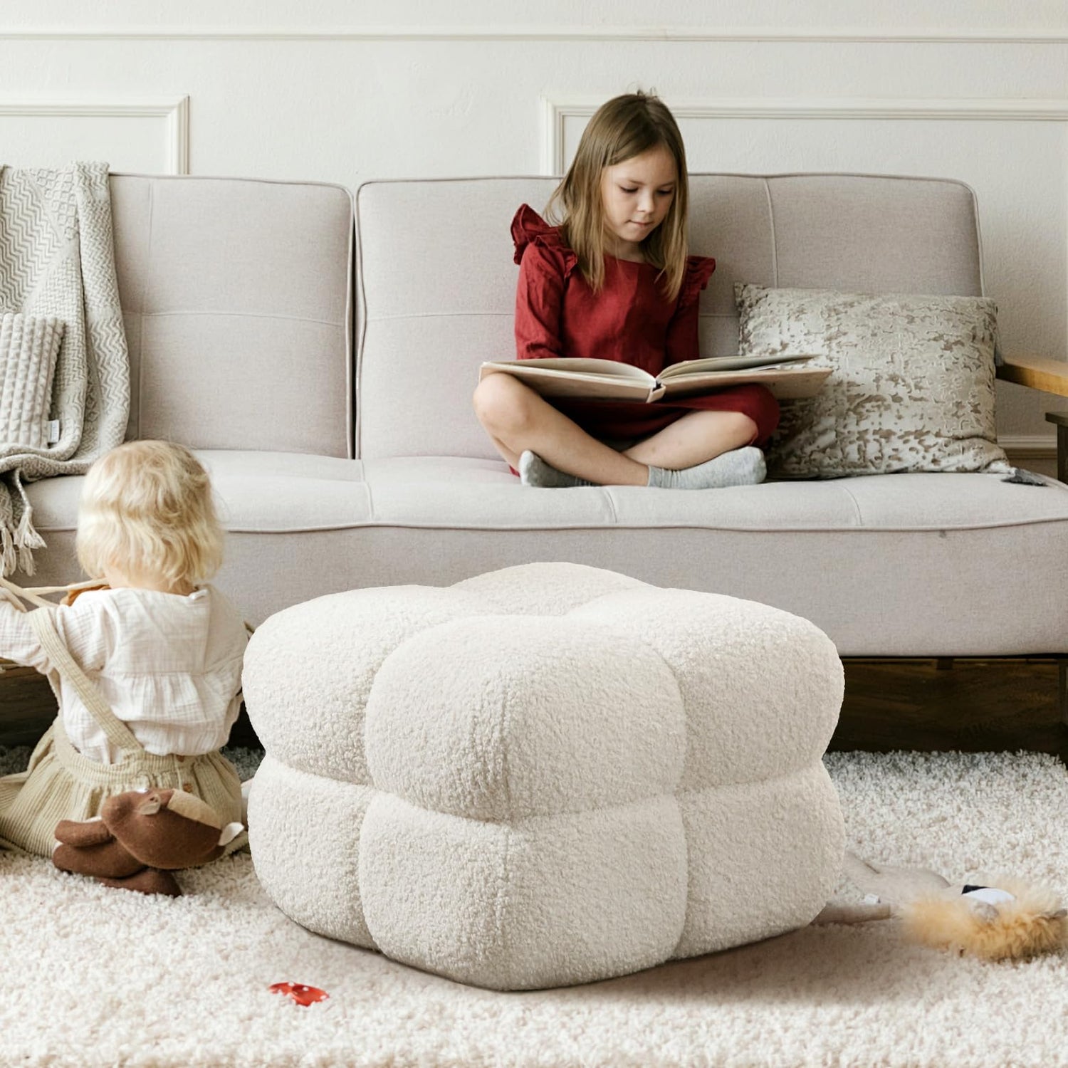 Zesthouse Square Pouf Ottoman, Modern Ottoman Coffee Table for Living Room, Fuzzy Sherpa Ottoman Foot Rest, Upholstered Tufted Ottoman Stool for Couch, White