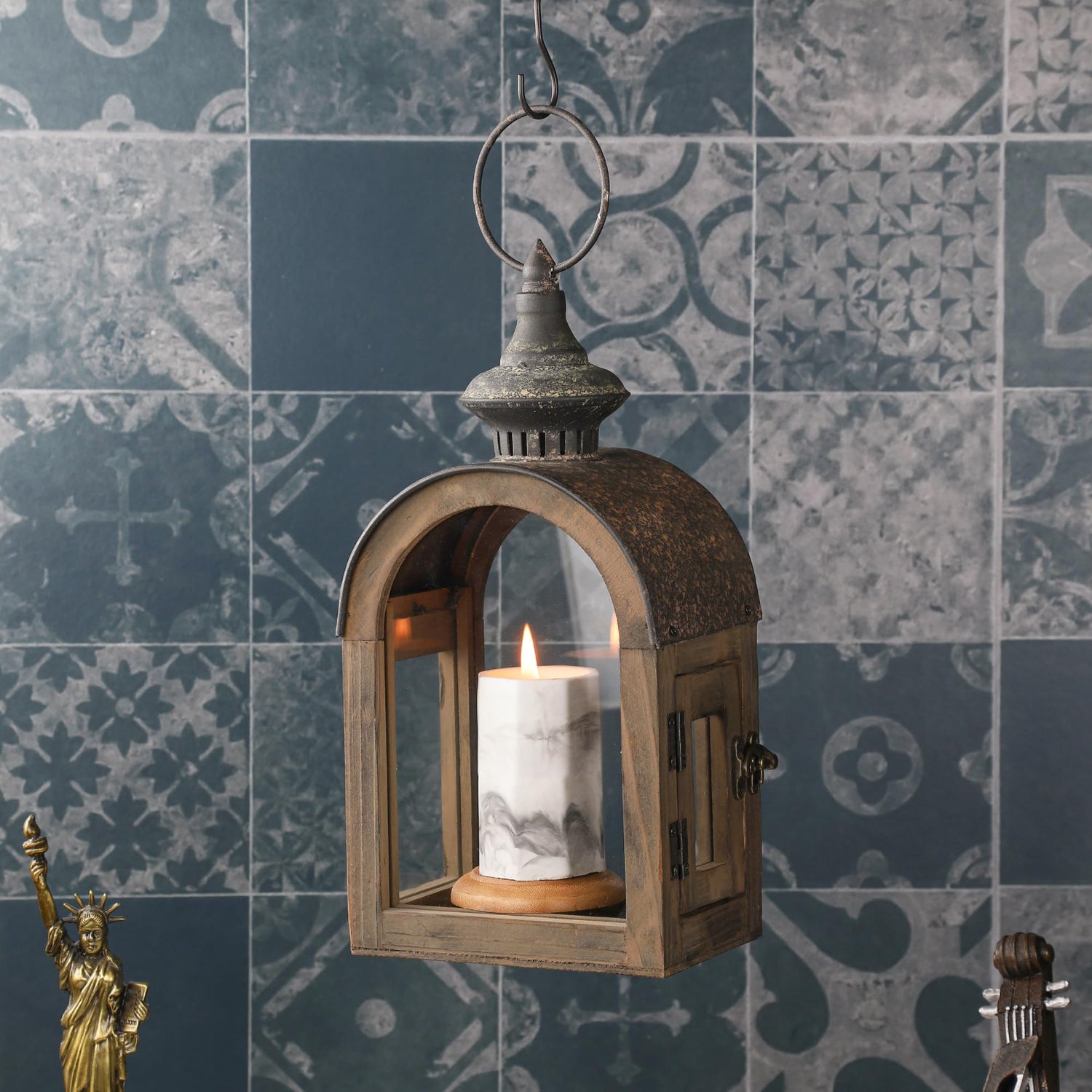 12" High Wooden Dome Lantern Made of Solid Fir Wood and Real Glass in Rustic Brown Finish with Rustic Metal Top, Hurricane Lantern, Farmhouse Lantern (1, Brown, Small)