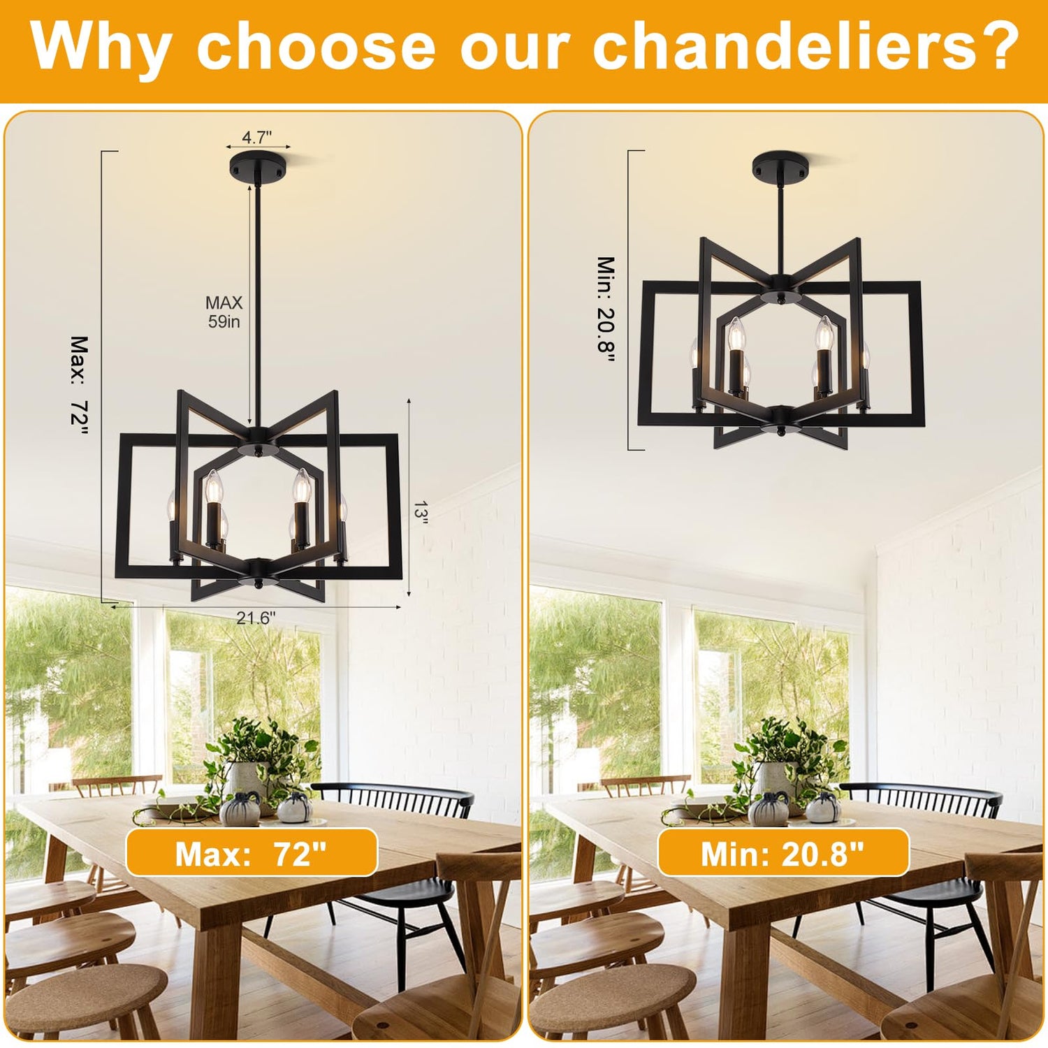 - Adjustable Height Large Chandelier - Modern chandelier diameter: 21.3 in, Hanging Height: 21.7~72 in, Ceiling Suction Cups: 4.7 in. Kitchen chandelier are equipped with adjustable booms, and the height of the kitchen island lighting can be easily adjusted according to your preferences. The kitchen lighting fixtures ceiling is allowed to be installed on sloped or flat ceilings.