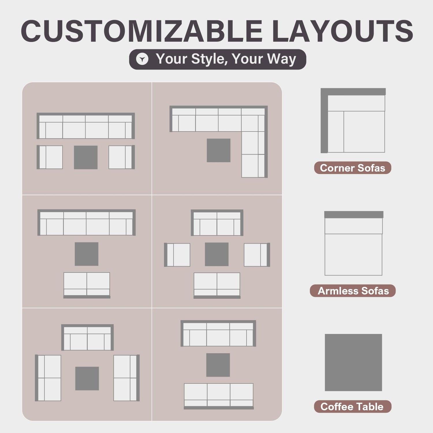 - Flexible Modular Layout – Arrange your patio sectional furniture set into U-shape, L-shape, or linear layouts to fit any patio or deck area. Connector clips keep each piece secure, creating a polished outdoor furniture set arrangement