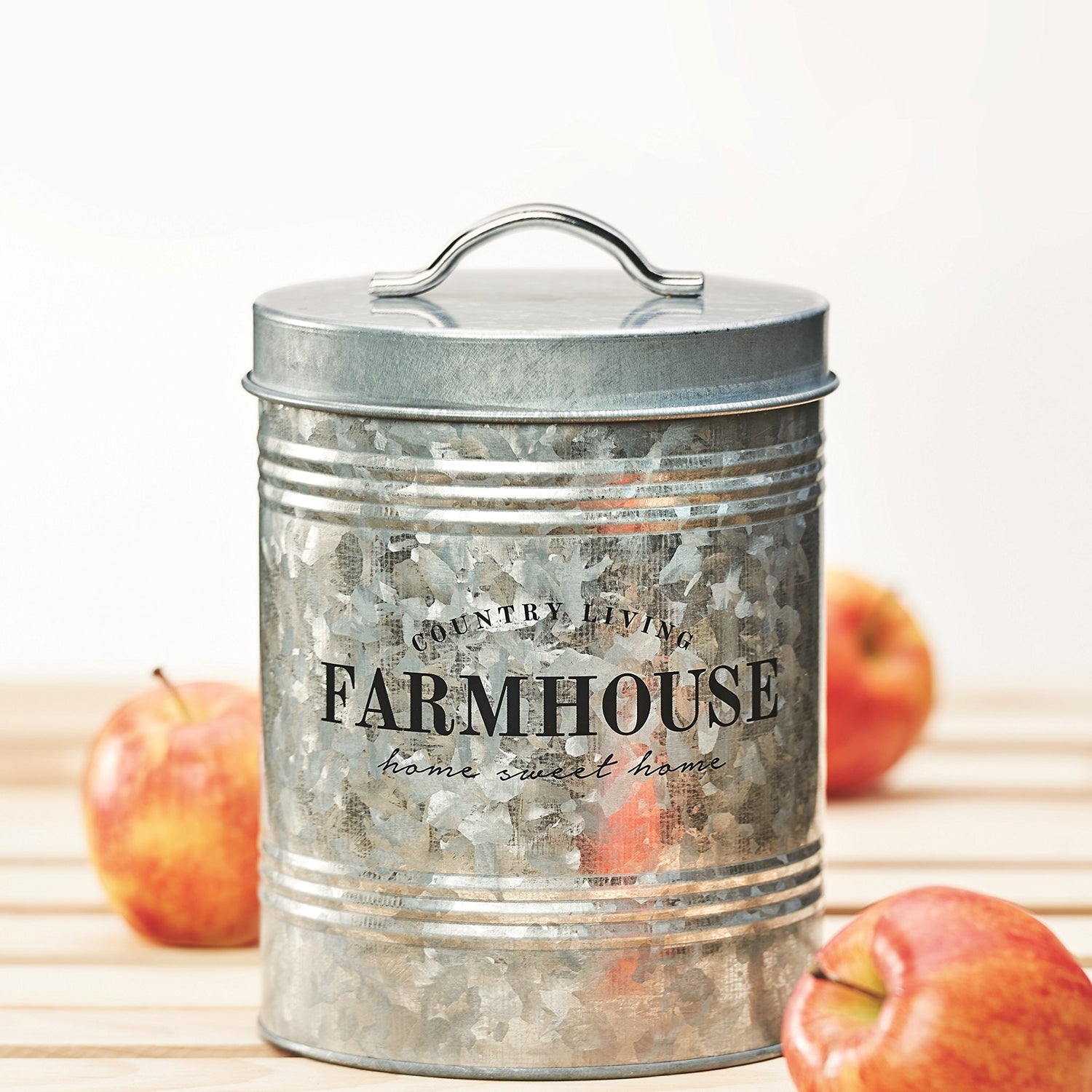 - Amici home's Farmhouse Canister has a ribbed body and is constructed with a galvanized finish
